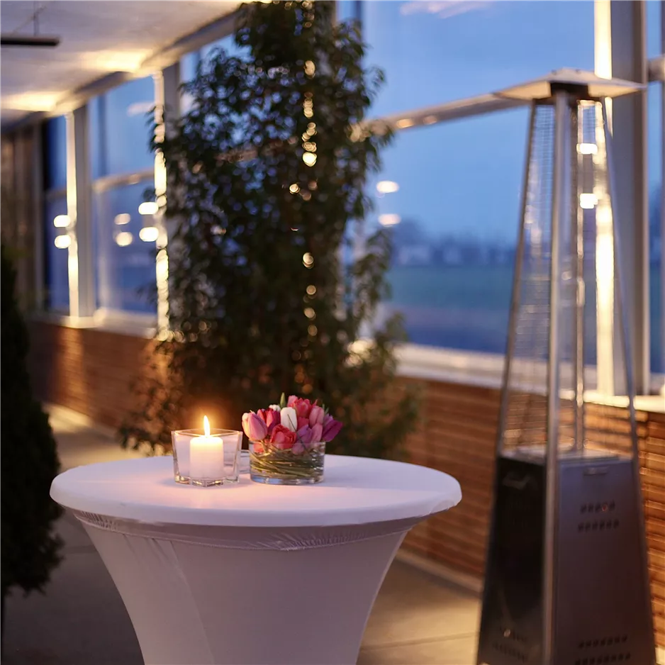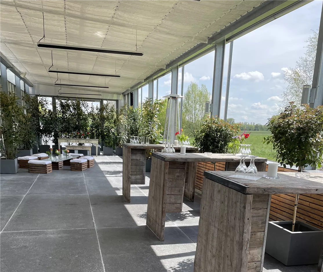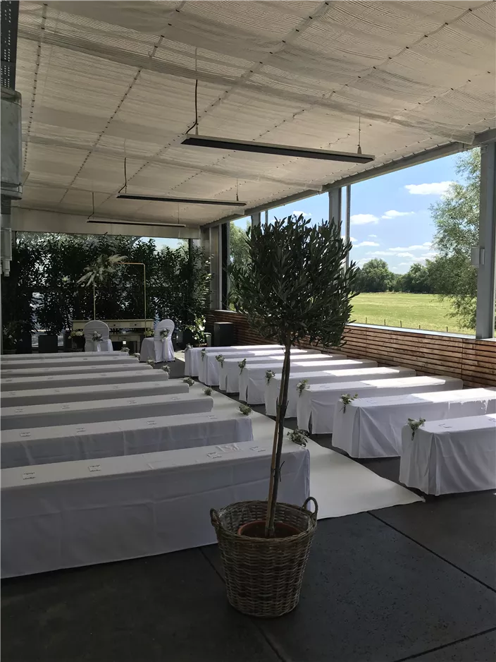 Die angrenzende wetterfeste Terrasse bietet Platz für eine freie Trauung oder ein stilvolles Barbecue.
