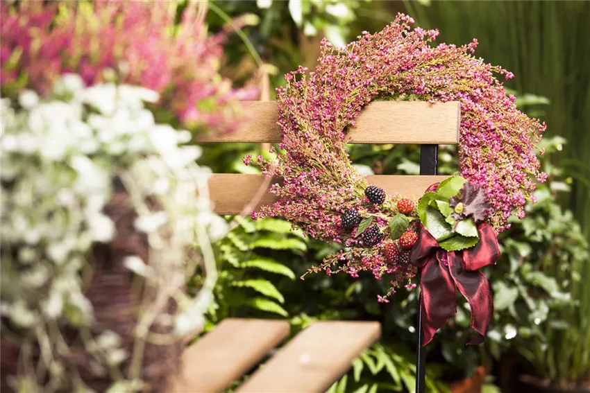 Damit der Kranz auch in die vorhandene Herbstdekoration passt, kommen jetzt noch die Pflanzen zum Einsatz. Die Besenheide knapp oberhalb der Wurzeln von der Pflanze abschneiden und mit Blumendraht am Kranz festbinden. Wenn das abwechselnd auf beiden Seiten gemacht wird, sieht der Krank am Ende schön symmetrisch aus. Um dem Kranz noch mehr Farbe zu verleihen, können zwischen den Heidezweigen noch Zweige von Olive, Eukalyptus oder Lorbeer festgebunden werden. Schleierkraut und Gräser eignen sich übrigens auch sehr gut für den Herbstkranz.