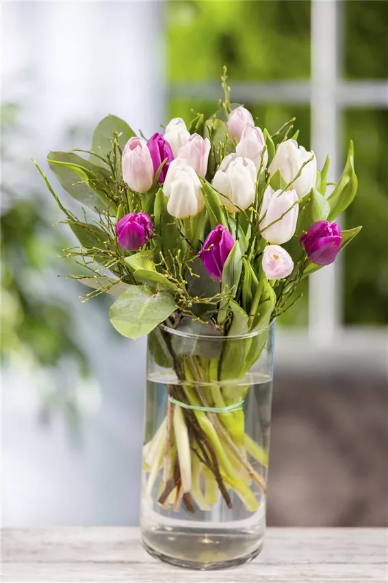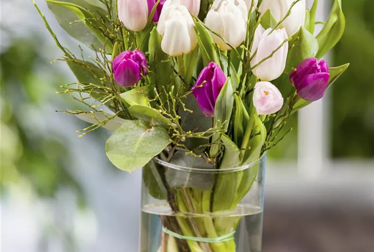 Über den sogenannten Wurzeldruck gelangt das in die Wurzelzellen aufgenommene Wasser in die Wasserleitungsgefäße. Welche Kräfte dabei in einer Pflanze wirksam werden, können Sie im Frühjahr beobachten, wenn Sie eine Weinrebe oder den Ast einer Birke schneiden: Aus den Schnittwunden tritt für längere Zeit Flüssigkeit aus. Wassermoleküle hängen dich aneinander und sorgen so dafür, dass der „Wasserfaden“ im Innern des Stamms oder Stängels nicht abreißt. Über die Blätter verdunstet das Wasser wieder, und so entsteht wie bei einem Strohhalm, aus dem getrunken wird, ein Sog, der ständig Wasser in die Spitzen transportiert. Wird die Pflanze von ihrem Wurzelstock getrennt, reißt dieser wasserfaden ab. Nach einiger Zeit im Trockenen fängt die Pflanze an zu welken. Kommt der Stängel rechtzeitig wieder ins Wasser, kann der Transport-Kreislauf fortgesetzt werden. Allerdings besteht die Gefahr, dass sich zwischenzeitlich Luft in den Leitungsbahnen gesammelt hat. Dies erschwert die Wasseraufnahme und macht einen frischen Anschnitt nötig. Die Luft wird so eliminiert, der Wasserfaden schließt sich wieder, und der Blütenstängel steht aufrecht in der Vase.