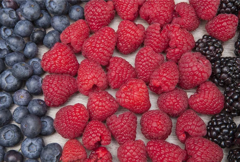Wussten Sie, dass Himbeeren ( Rubus idaeus ) in Europa schon seit 1.500 Jahren kultiviert werden? Man unterscheidet sommer- und herbsttragende Sorten. Erstere (zum Beispiel ’Schönemann’, ’Malling Promise’) liefern erst im 2. Jahr Früchte, während die herbsttragenden Sorten (zum Beispiel ’Autumn Bliss’, ’Aroma Queen’) im Frühjahr ihre Ruten ausbilden und schon wenige Monate später und bis in den Oktober hinein Früchte präsentieren. Bei den Herbstsorten fällt die Ernte etwas geringer aus als bei den Sommersorten. Brombeeren ( Rubus fruticosus ) haben einen ähnlichen Wuchs wie Himbeeren, nur werden die Ruten länger und sollten aufgebunden werden. Die Früchte erscheinen an den 2jährigen Ruten, die nach der Ernte abgeschnitten werden. Es gibt dornige und dornenlose Sorten, besonders empfehlenswert sind ’Navaho’ und ‚Loch Ness’. Ernte ist je nach Sorte von Juni bis Oktober. Himbeeren und Brombeeren gedeihen als Waldpflanzen gut im lichten Schatten.