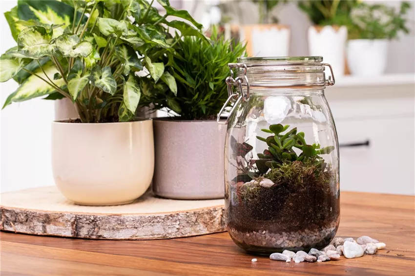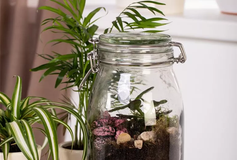 Ein Mal gegossen ist so ein kleines Biotop im Glas ein richtiger Selbstläufer. Und in diesem kleinen Biotop lassen sich viele schöne Pflanzen halten. Dafür benötigt man lediglich ein Bügelglas, Kies, Pflanzen, Erde und Dekoelemente.