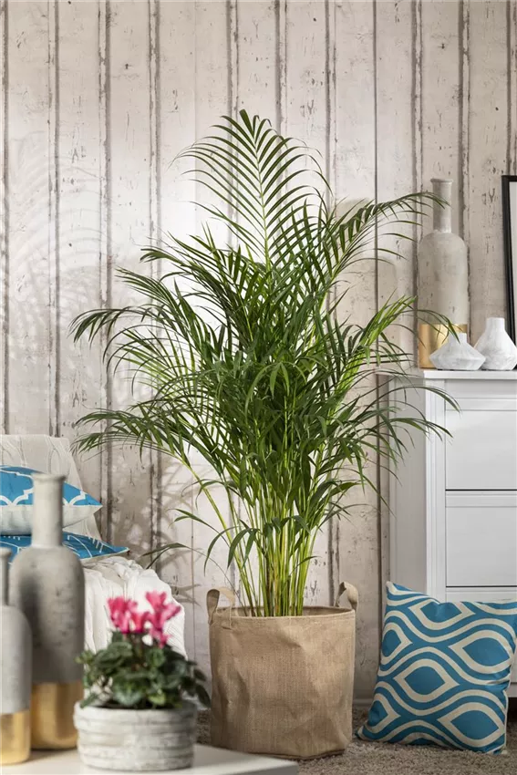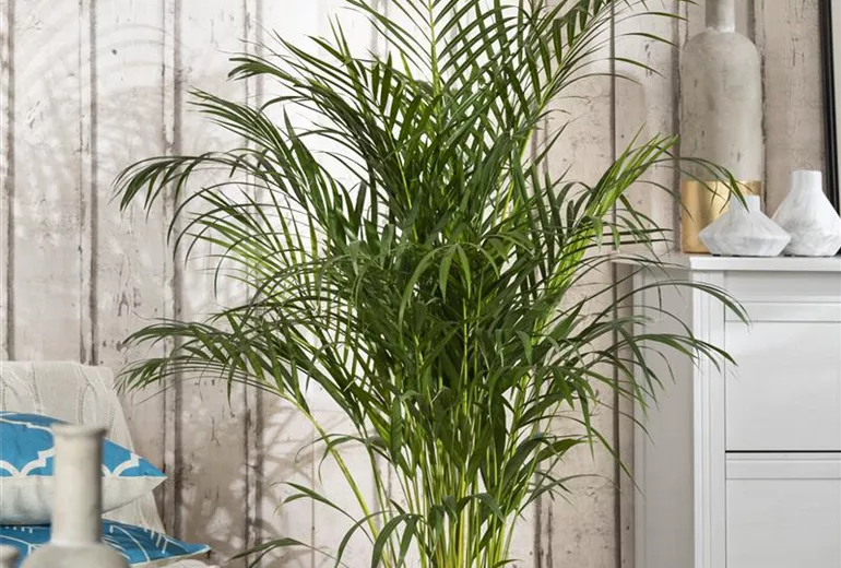 Die Dattelpalme ( Phoenix canariensis, P. dactylifera ) braucht im Gegensatz zu vielen anderen Arten nicht nur einen hellen, sondern einen richtig sonnigen Standort. Dankbar ist sie für enthärtetes Gießwasser. Die dritte Art, P. roebelenii , bevorzugt es hingegen schattig. Die Betelpalme ( Areca catechu ) präsentiert breite, dunkelgrüne, v-förmige Blätter und schätzt einen halbschattigen Standort und hohe Luftfeuchtigkeit; mehrmals wöchentlich besprühen bzw. die Luftfeuchte durch einen Raumluftbefeuchter erhöhen. Die Goldfrucht- oder Arecapalme ( Chrysalidocarpus ) zählt mit ihren langen, kammartig gefiederten Wedeln zu den beliebtesten Zimmerpalmen; sie wächst sehr schnell und sollte hell bis halbschattig stehen; bei direkter Sonneneinstrahlung verfärben sich die Blätter gelb.