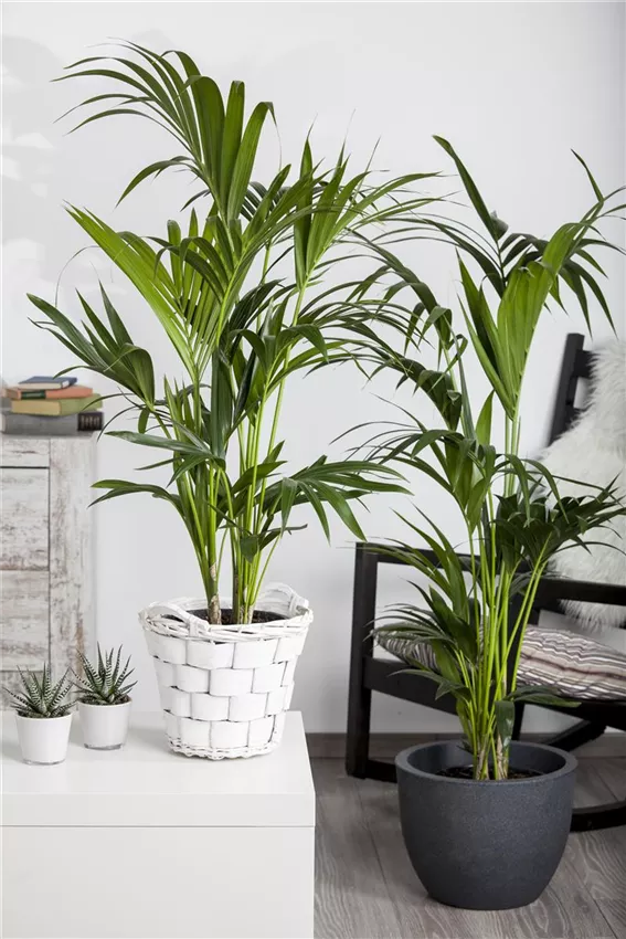 Wenn der Frühling noch nicht in Sicht ist und auch keine Fernreise auf dem Programm steht, wird unsere Sehnsucht nach exotischen Gefilden besonders groß. Dann hilft nur eins: Holen Sie sich die Tropen in Ihre vier Wände! Palmen bilden eine besonders attraktive „Untergruppe“ der Zimmerbäume. Viele Arten erreichen beeindruckende Wuchshöhen von zwei Metern oder mehr. So zählt die Bergpalme ( Chamaedorea elegans ) zu den besonders schnell wachsenden Vertretern ihrer Familie. Diese Zierpalme besitzt grazile, gefiederte Wedel und ist ausgesprochen pflegeleicht. Sie bevorzugt halbschattige bis schattige Standorte – keine direkte Sonneneinstrahlung! Gelegentliches Besprühen beugt braunen Blattspitzen vor. Die Kentiapalme ( Howea forsteriana ) besticht durch elegante, filigrane Wedel in dunklem Grün; sie kommt mit relativ wenig Licht und trockener Luft gut zurecht, was sie zur Ausnahmeerscheinung unter dem Palmen macht und auch für dunklere Raumecken prädestiniert. Zugluft und direkte Sonne meiden! Die Fischschwanzpalme ( Caryota mitis ) besitzt wie abgerissen aussehende Blätter, die ihr eine aparte Anmutung geben. Sie braucht einen hellen Standort und muss immer leicht feucht gehalten werden – Staunässe jedoch unbedingt vermeiden.