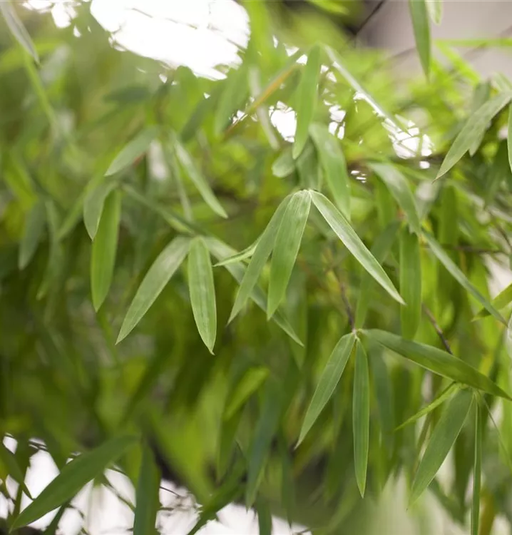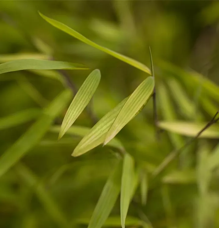 Die immergrünen Blätter des Gartenbambuses 'Jiuzhaigou 1' sind mittelgrün, lanzettlich.