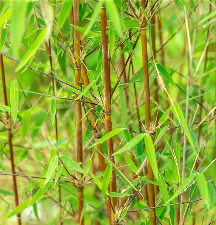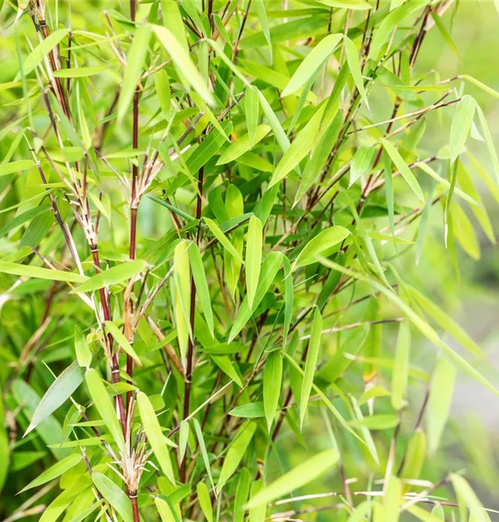 Gartenbambus 'Jiuzhaigou 1' zeichnet sich durch seine grün-roten Halme aus.
