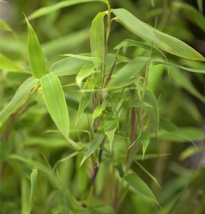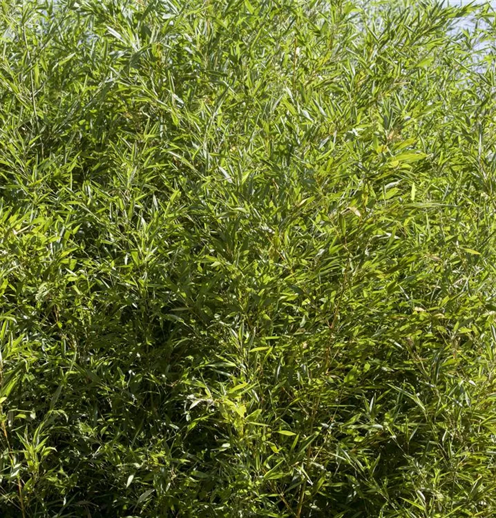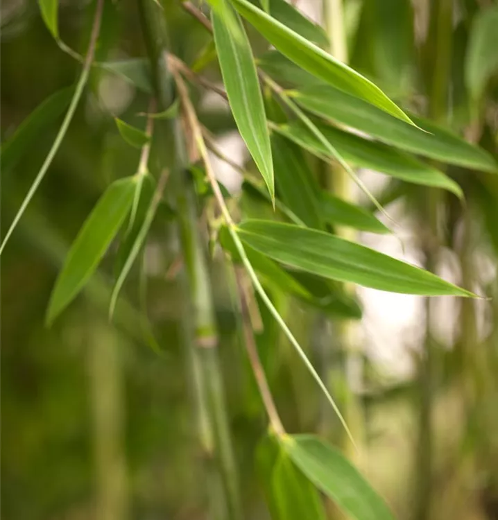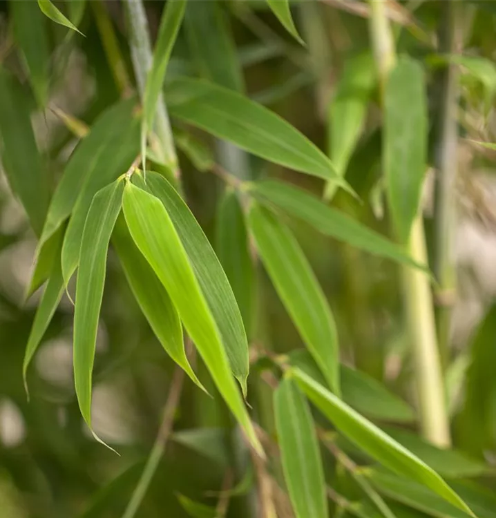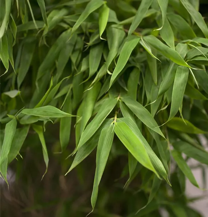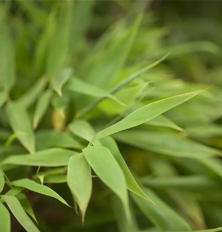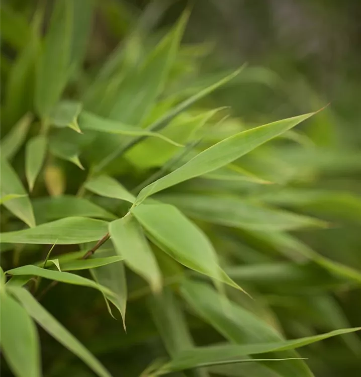 Die immergrünen Blätter des Muriel Schirmbambus sind dunkelgrün, lanzettlich.