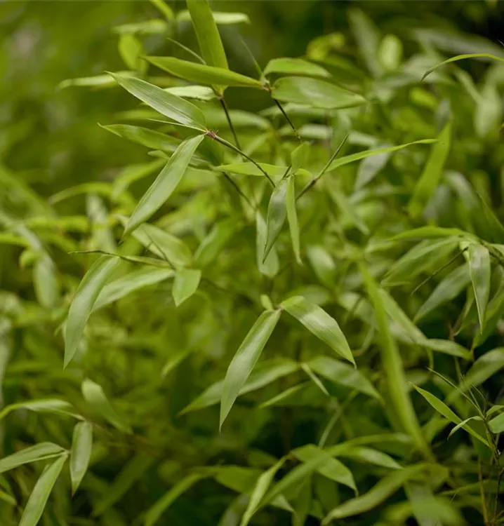 Die immergrünen Blätter des Gelben Bambus sind dunkelgrün, lanzettlich.