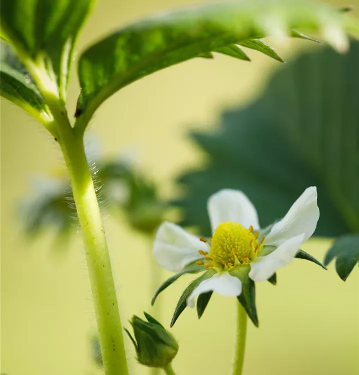 Die wintergrünen Blätter der Erdbeere 'Elan' sind mittelgrün, gefiedert, gesägt.