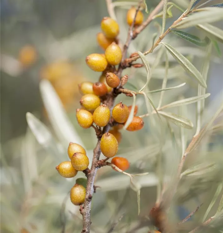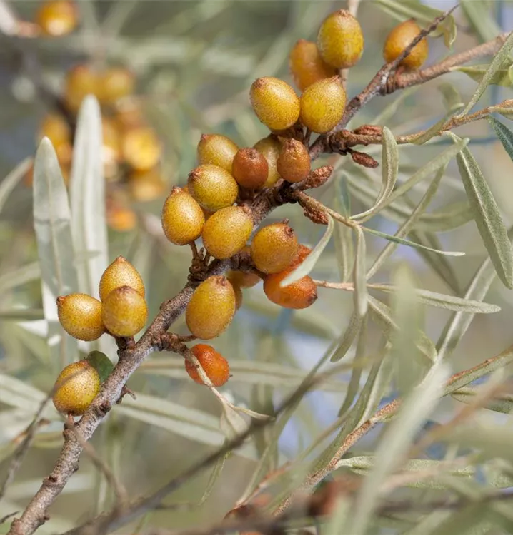 Der Sanddorn (Hippophae rhamnoides) bildet orange-rote Beeren. Diese sind saftig und säuerlich, aromatisch im Geschmack. Für eine ertragreiche Ernte ab August schaffen durchlässiger, kalkhaltiger, sandiger Boden und ein sonniger Standort optimale Bedingungen.