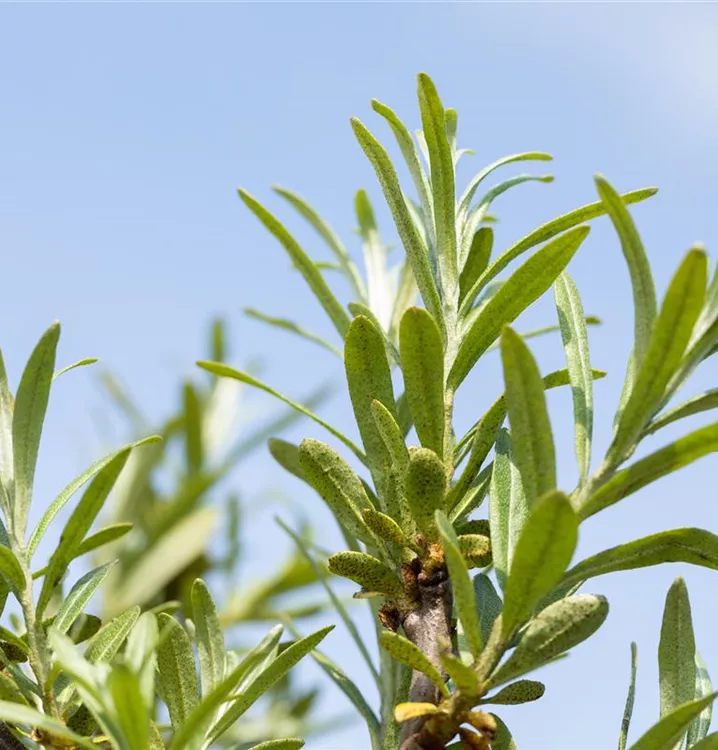 Die sommergrünen Blätter des Sanddorns sind grau-grün, lanzettlich, wechselständig. Diese sind etwa 2 - 5 cm groß. Lange haftend.