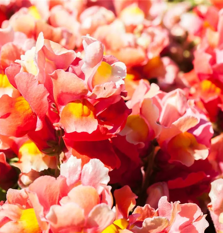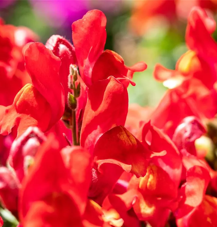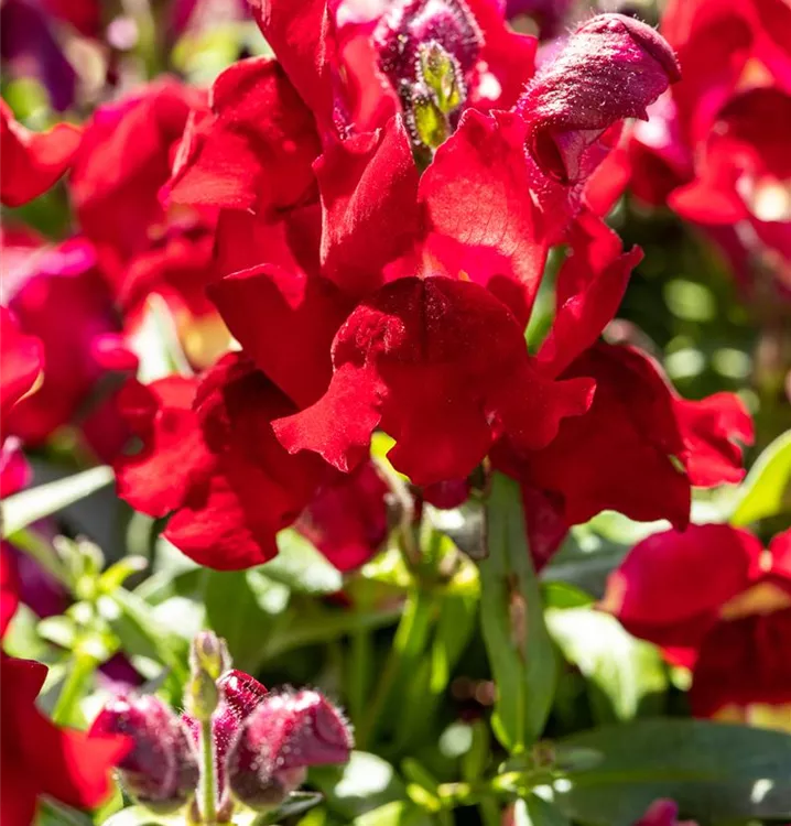 Das Große Löwenmaul (Antirrhinum majus) ist eine beliebte, pflegeleichte Pflanze für den Balkon, die während der gesamten Saison unzählige rote Blüten bildet. Ein sonniger bis halbschattiger Standort und ein durchlässiges Substrat werden bevorzugt.