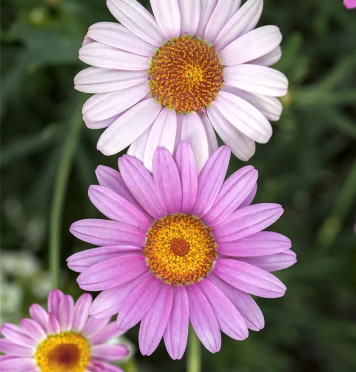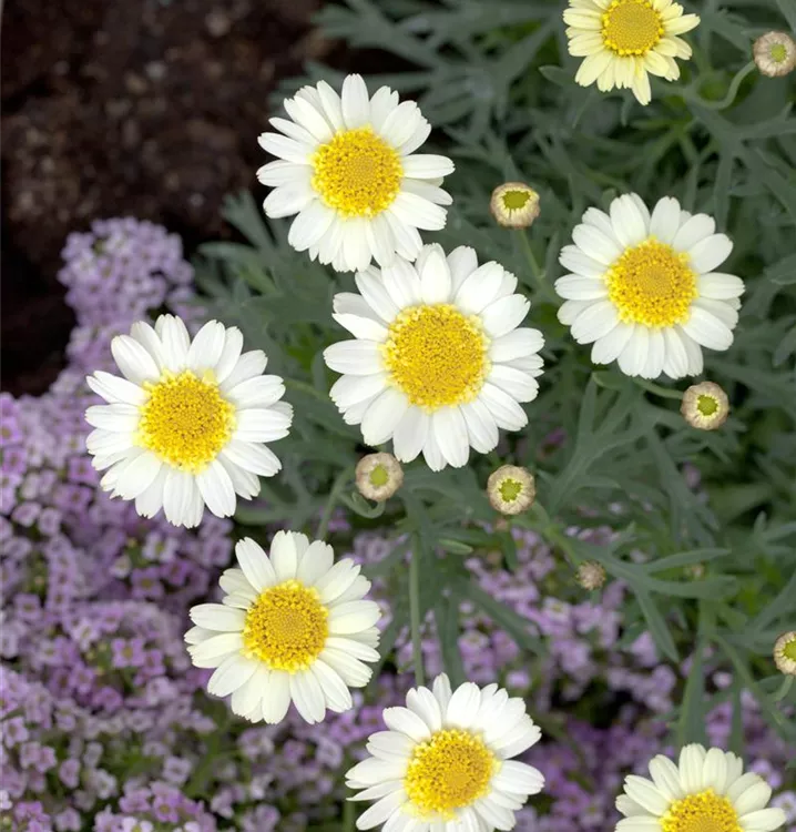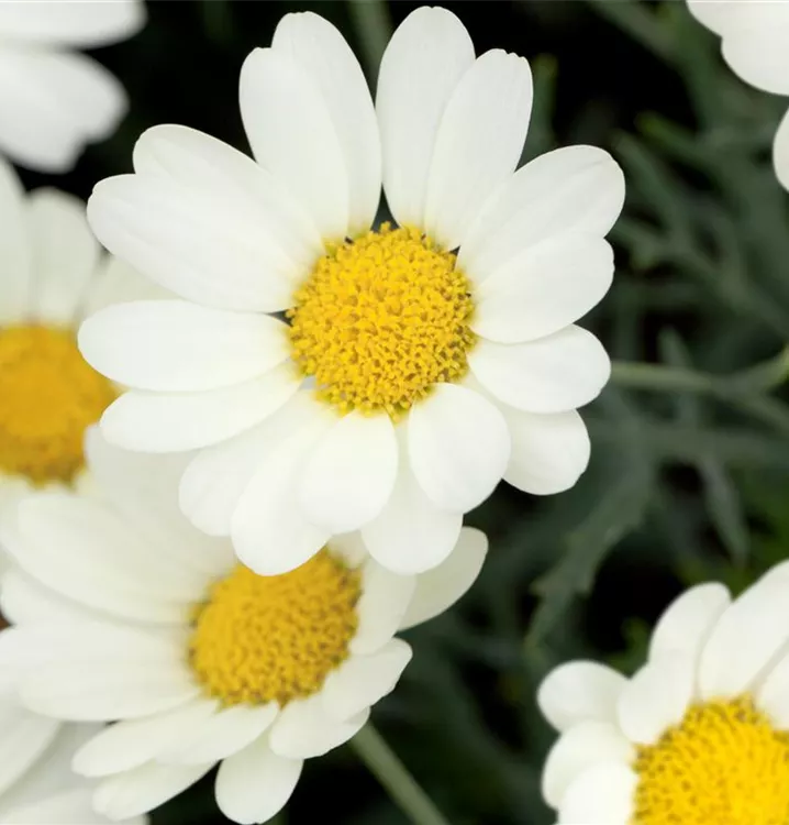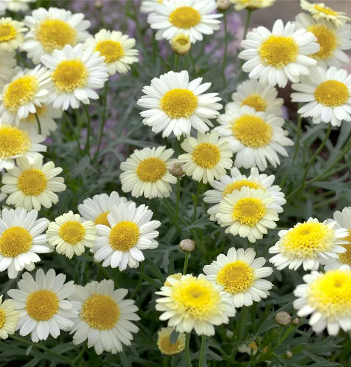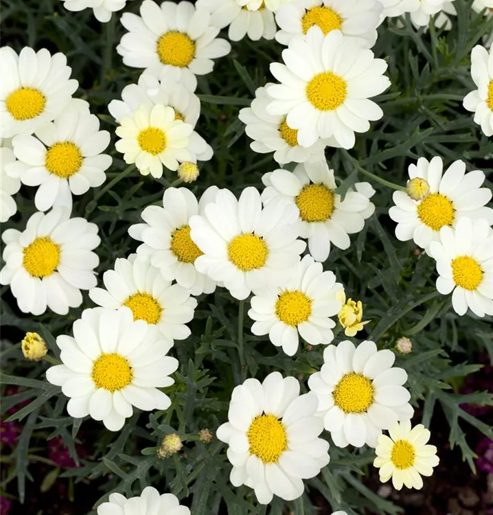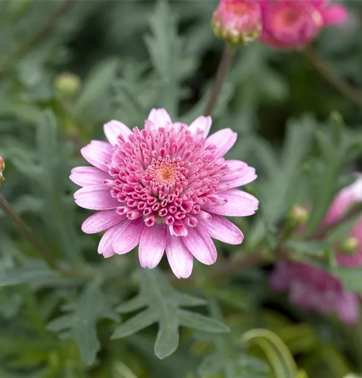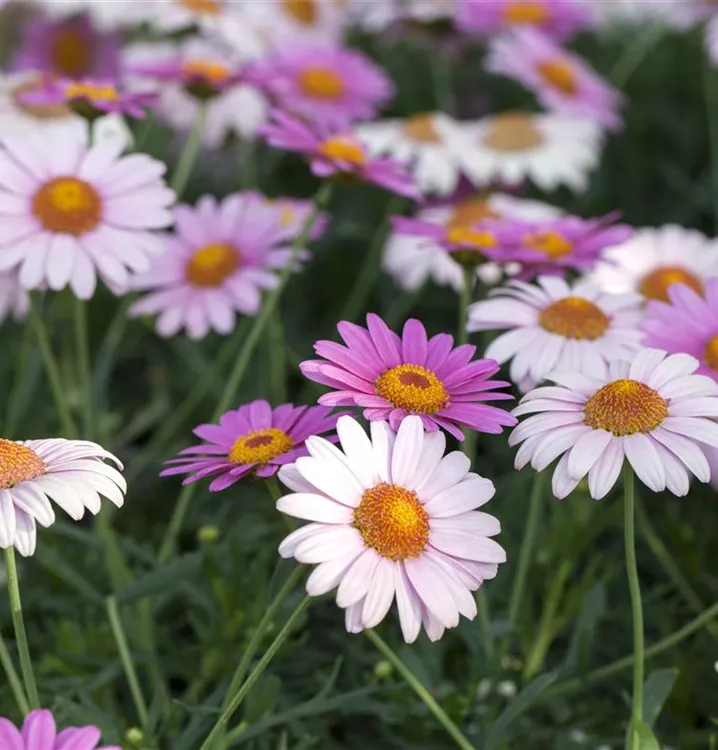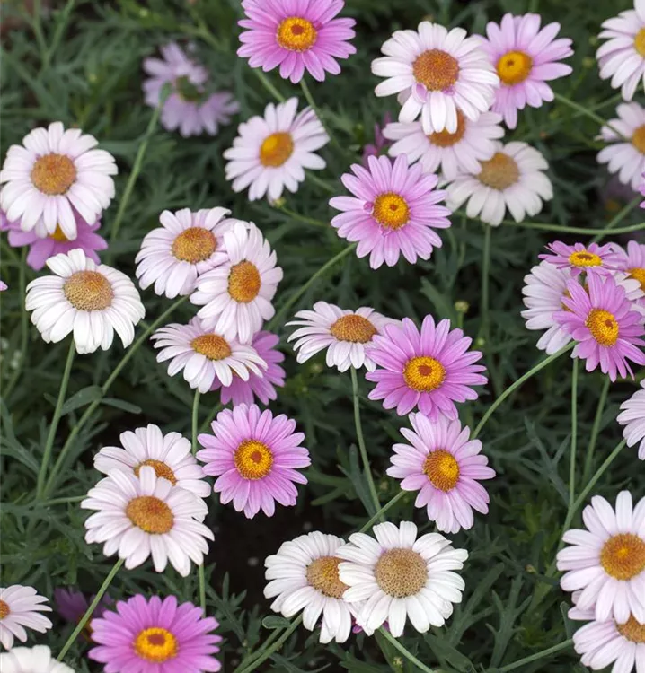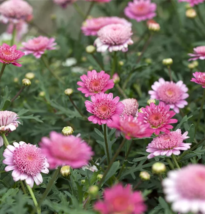Die Strauchmargerite (Argyranthemum frutescens) ist eine beliebte Pflanze für den Balkon, die während der gesamten Saison unzählige weiße, gelbe oder rosafarbene Blüten bildet. Die mittelgrünen Blätter sind gefiedert. Ein sonniger Standort und ein durchlässiges Substrat werden bevorzugt.