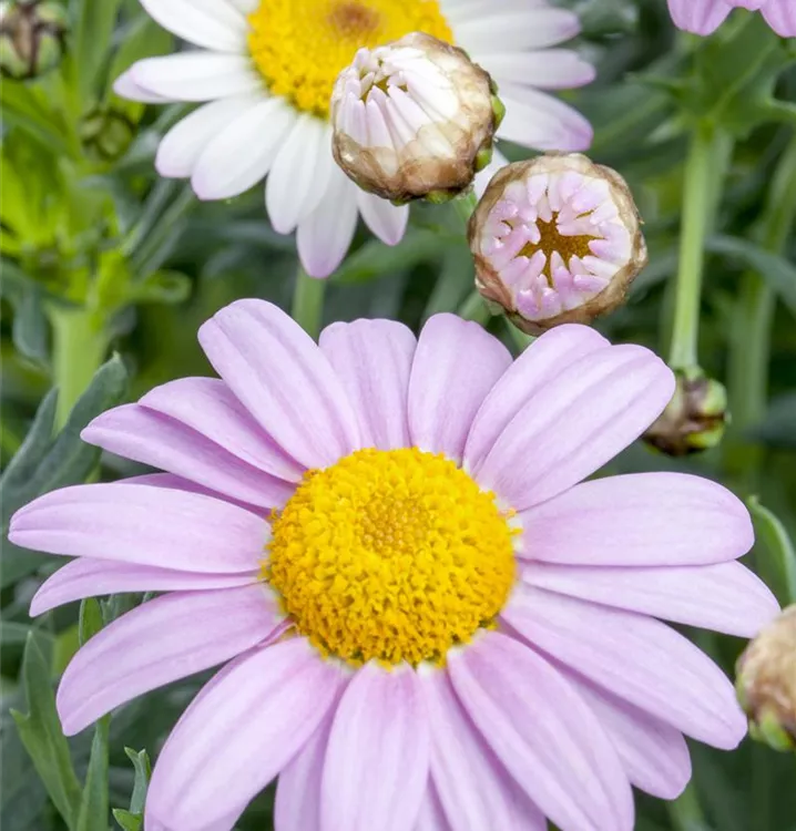 Argyranthemum frutescens, rosa bildet während der gesamten Saison zahlreiche körbchenartige, rosafarbene Blüten.