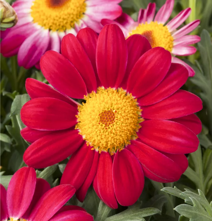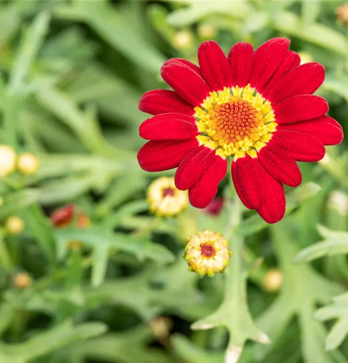 Argyranthemum frutescens, rot bildet während der gesamten Saison zahlreiche körbchenartige, rote Blüten.