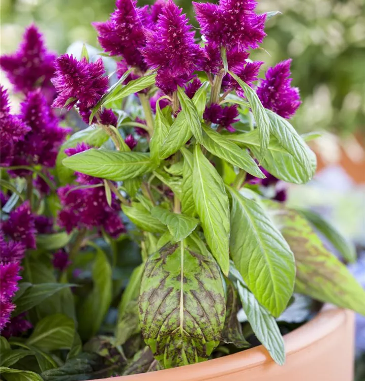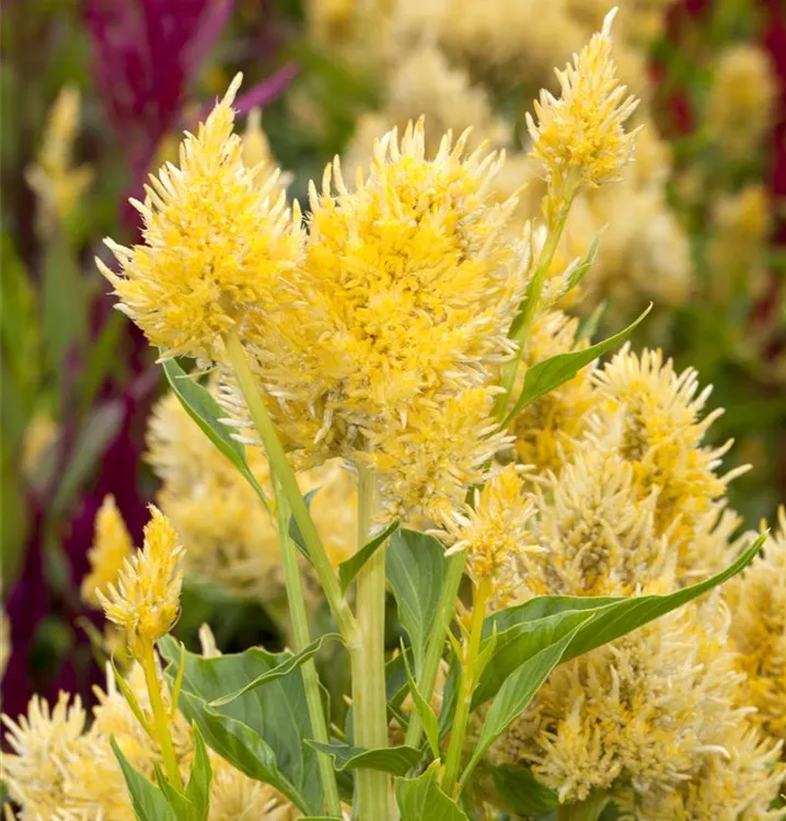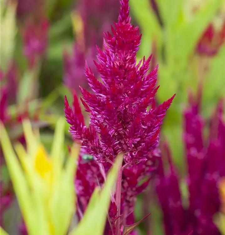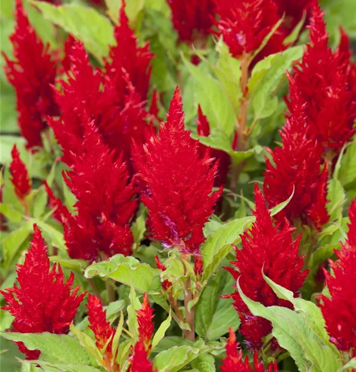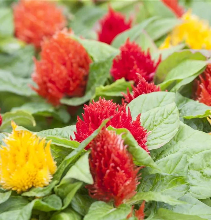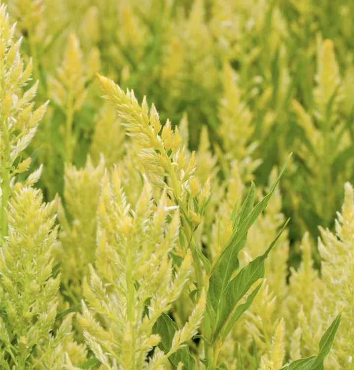 Die Federbusch-Celosie (Celosia argentea var. plumosa) ist eine beliebte Pflanze für den Balkon, die während der gesamten Saison unzählige gelbe, rote oder orangefarbene Blüten bildet. Ein sonniger Standort und ein durchlässiges Substrat werden bevorzugt.
