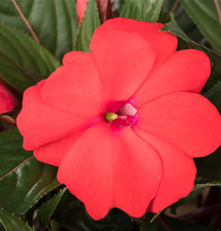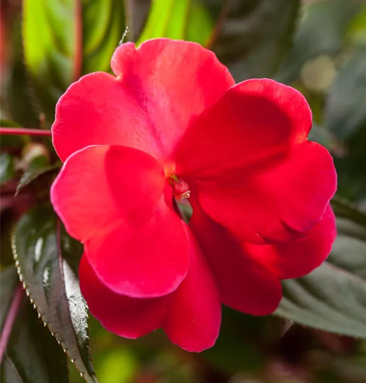 Impatiens neuguinea, rot bildet während der gesamten Saison zahlreiche rote Blüten.