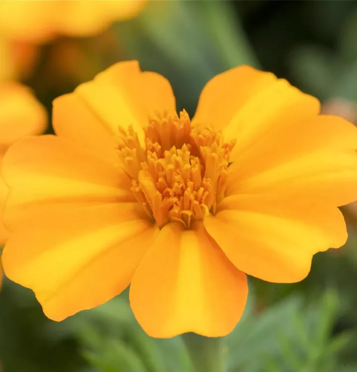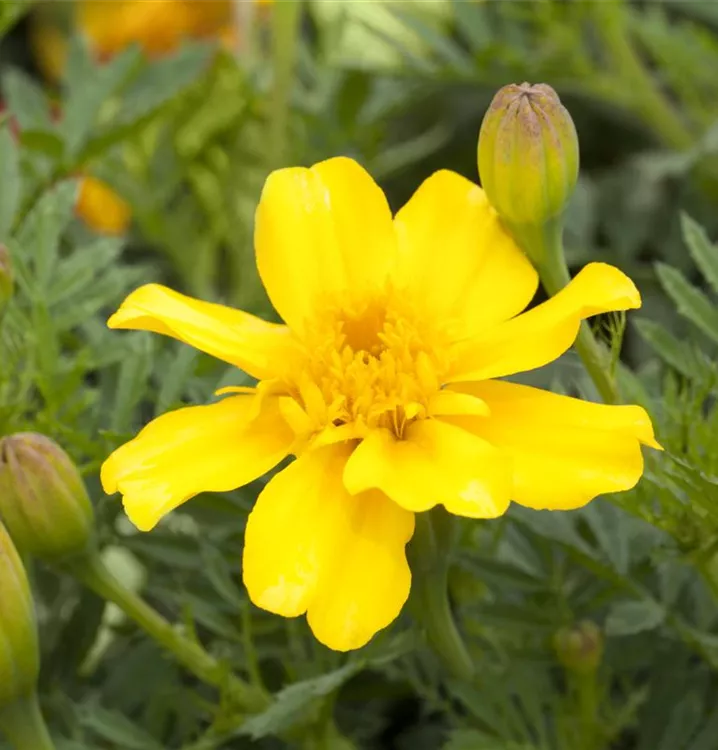 Die sommergrünen Blätter der Niedrige Studentenblume sind dunkelgrün, gefiedert.