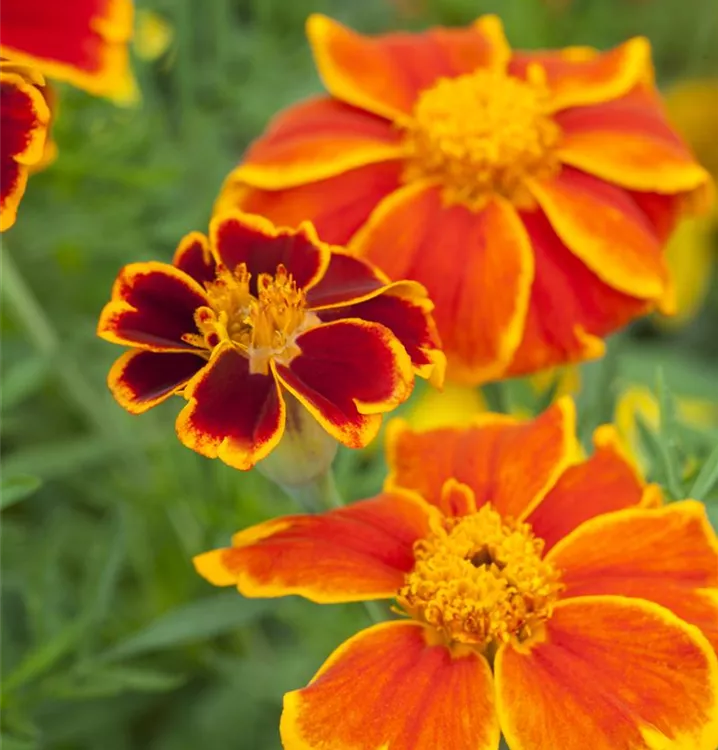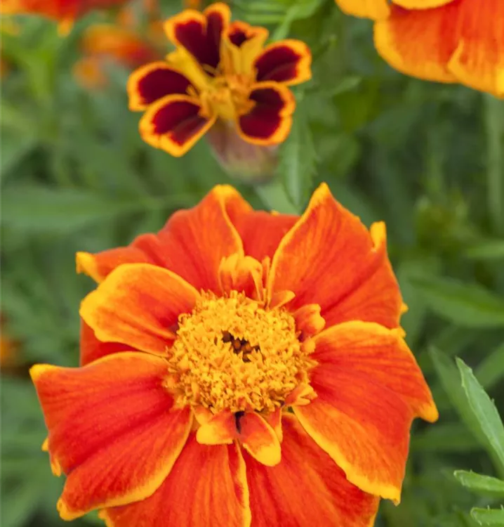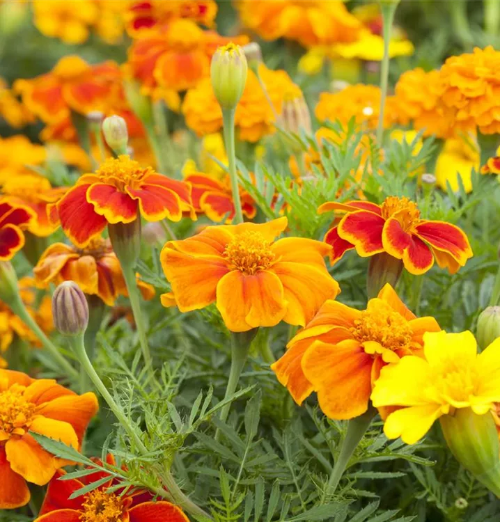 Die Niedrige Studentenblume (Tagetes patula) ist eine beliebte, pflegeleichte Pflanze für den Balkon, die während der gesamten Saison unzählige gelbe, orangefarbene oder rote, leicht duftende Blüten bildet. Die dunkelgrünen Blätter sind gefiedert. Ein sonniger bis halbschattiger Standort und ein durchlässiges Substrat werden bevorzugt.