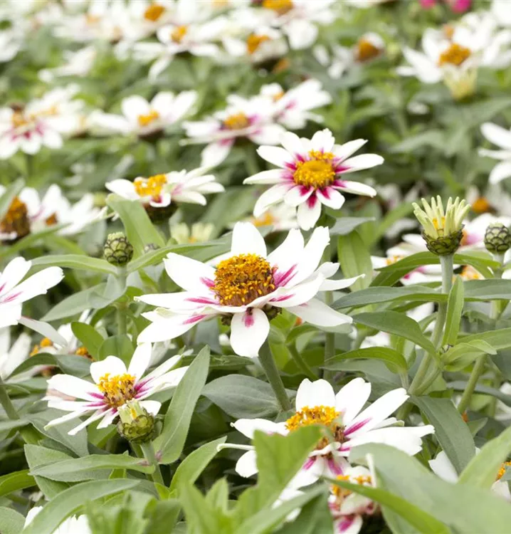 Die Zinnie (Zinnia elegans) ist eine beliebte Pflanze für den Balkon. Die unzähligen Blüten erscheinen, je nach Sorte, in verschiedenen Farben die ganze Saison hindurch. Ein sonniger Standort und ein durchlässiges Substrat werden bevorzugt.