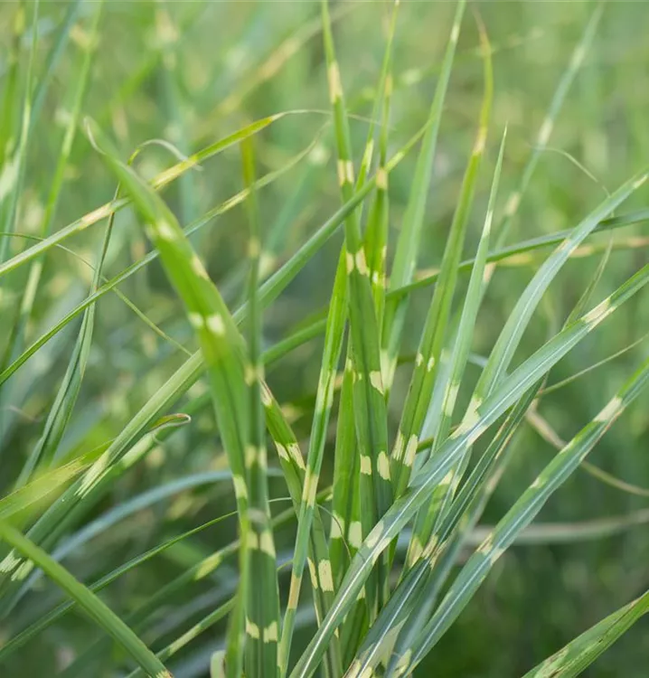 Hoher Blattschmuckwert. Die sommergrünen Blätter des Garten-Chinaschilfs 'Zebrinus' sind gelb-grün, lineal.