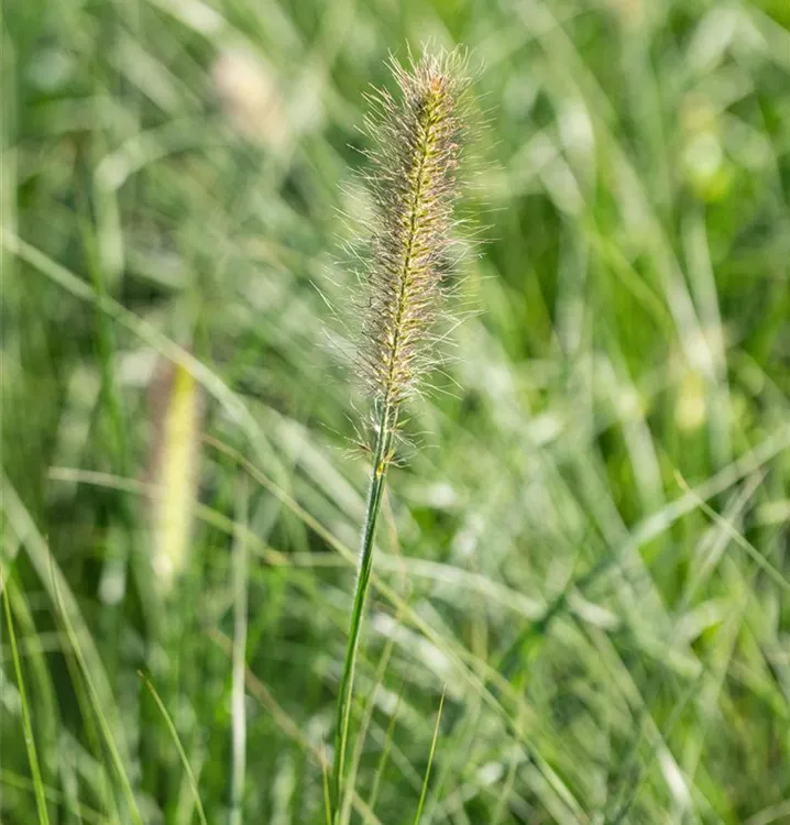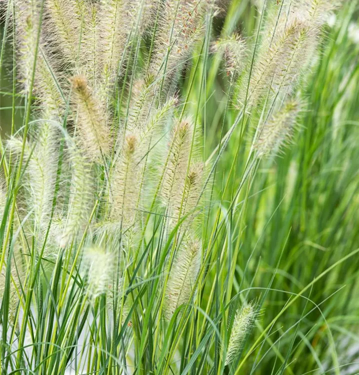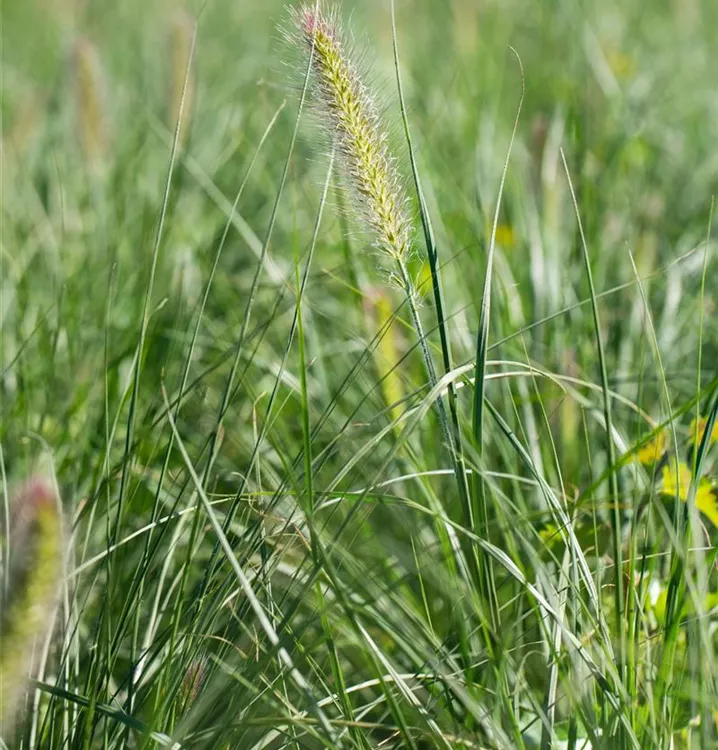 Das Garten-Federborstengras 'Little Bunny' (Pennisetum alopecuroides) ist mit seiner mittelgrünen Blattfärbung ein dekoratives Gestaltungselement im Garten, welches mit seinem buschigen Wuchs aber auch Kübel auf Balkon oder Terrasse ziert. Die bernsteingelben Blütenrispen schmücken diese Gras ab Sommer. An einem sonnigen Standort mit einem möglichst durchlässigen, nährstoffreichen Boden fühlt es sich am wohlsten. Bei günstigen Bedingungen erreicht dieses winterharte Gras eine Höhe von ca. 30 cm und wird bis zu 30 cm breit.