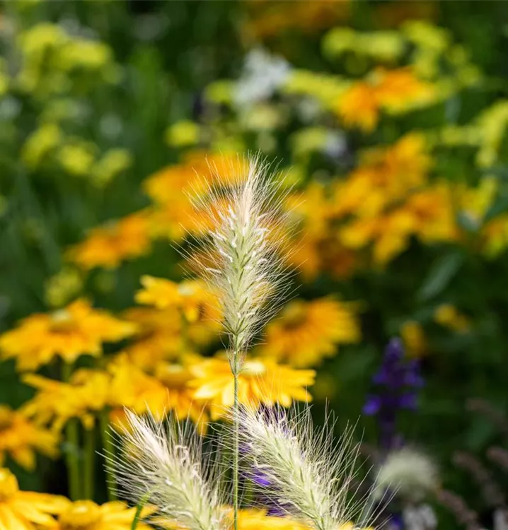 Die bernsteingelben Blüten des Garten-Federborstengras 'Little Bunny' erscheinen in Rispen von Juli bis September.