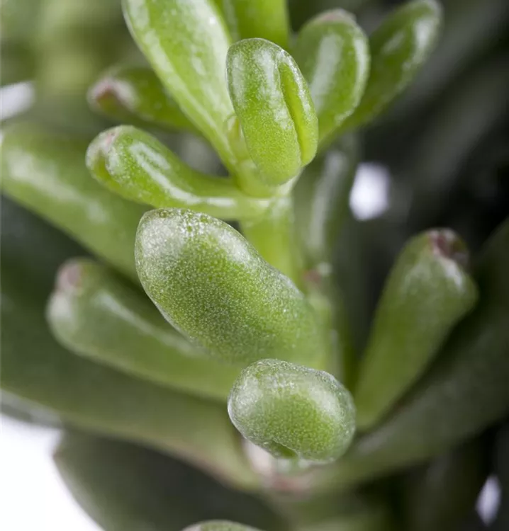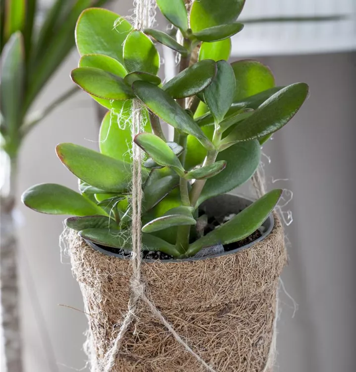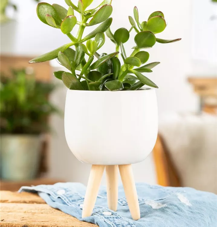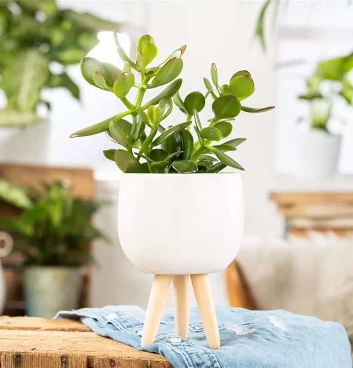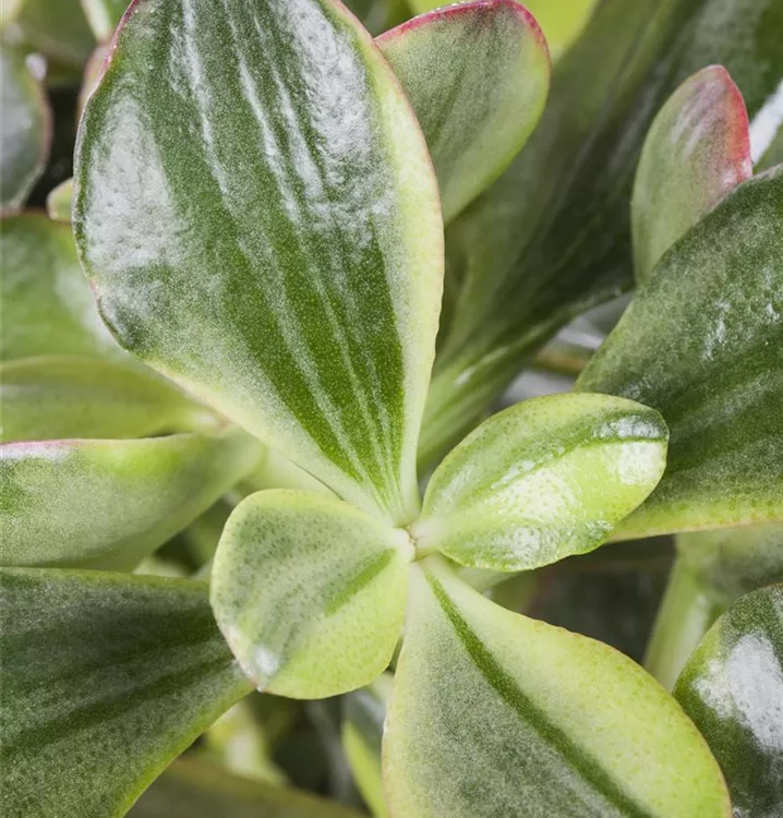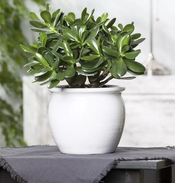 Der Geldbaum (Crassula ovata) ist eine Pflanze mit dunkelgrünen, dickfleischigen Blättern. Seine Blüten sind weiß und erscheinen von April bis Juli. Diese aufrechte Pflanze gedeiht am besten an einem sonnigen Standort.