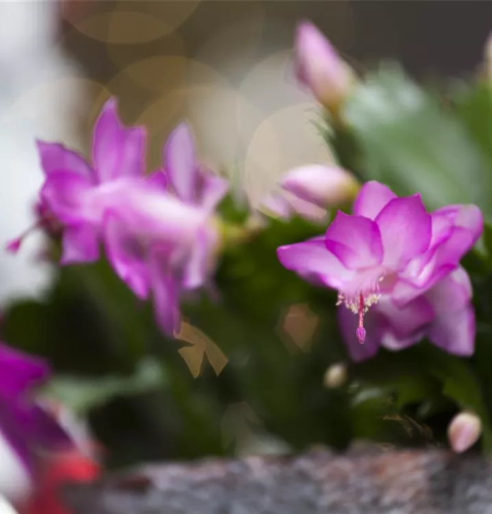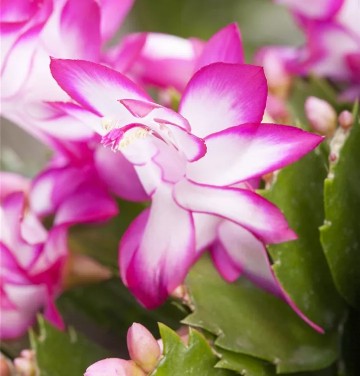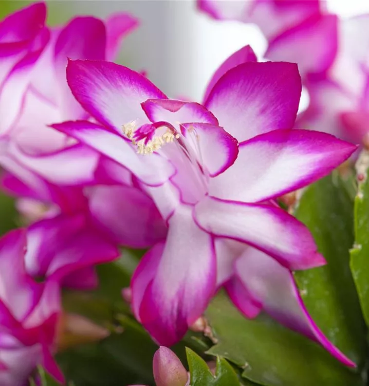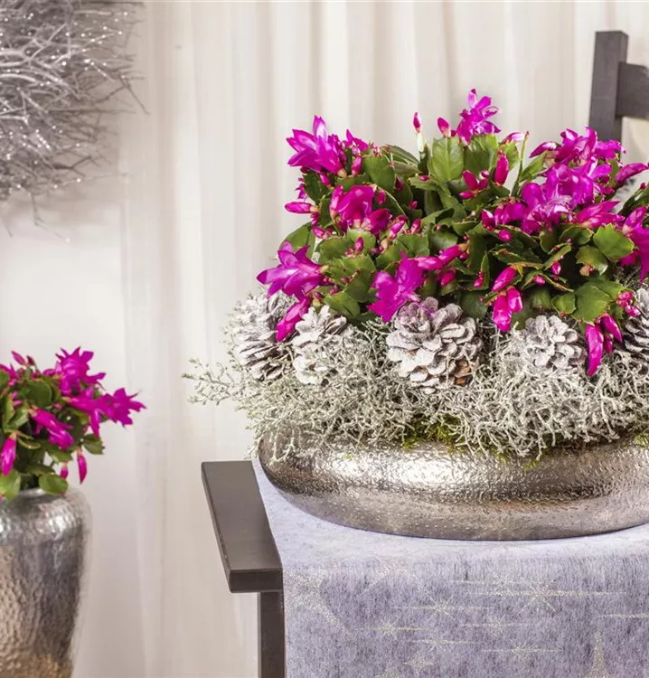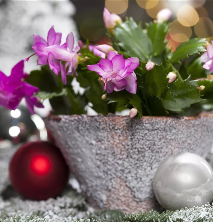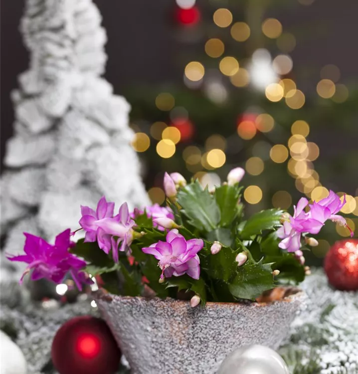Der Weihnachts-Kaktus (Schlumbergera bridgesii) ist eine Pflanze mit dunkelgrünen, dickfleischigen Blättern. Seine Blüten sind weiß, rosa oder rot und erscheinen von Dezember bis Februar. Diese aufrechte Pflanze gedeiht am besten an einem sonnigen bis halbschattigen Standort.