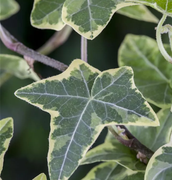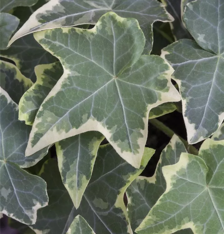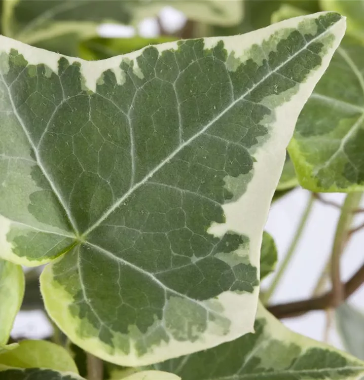 Hoher Blattschmuckwert. Die immergrünen Blätter des Weißbunten Efeus sind grün-weiß, herzförmig, ledrig, wechselständig, gelappt. Diese sind etwa 5 - 12 cm groß.