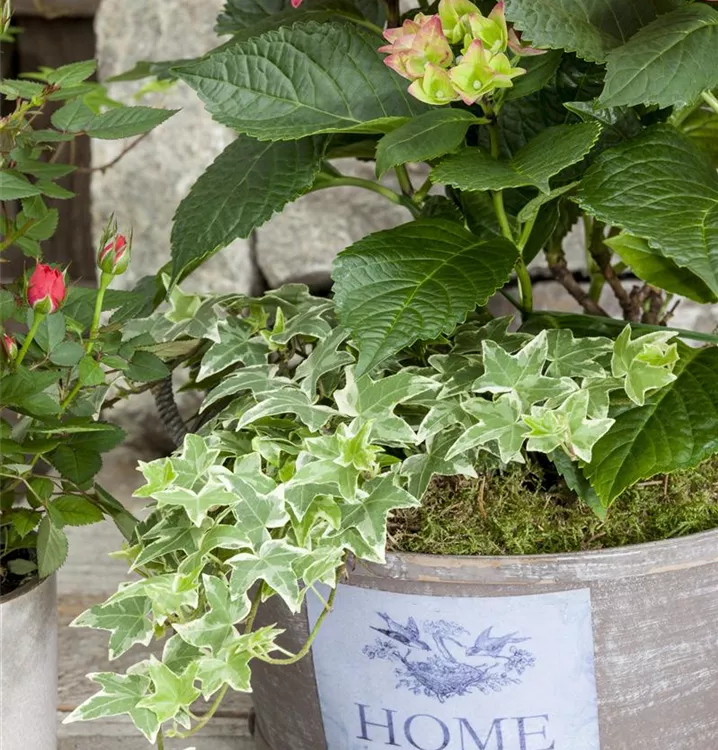 Hedera helix, grün-weiß ist ein Herzwurzler und bildet, je nach Boden, dicht verzweigte Wurzeln.