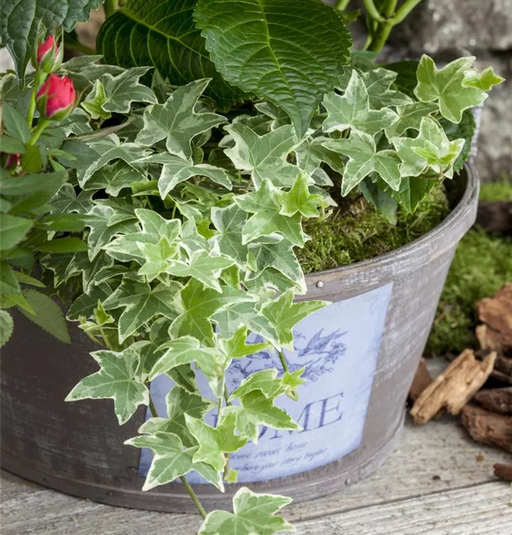 Weißbunter Efeu ist ein kriechend wachsendes Klettergehölz, welches eine Höhe von 20 - 30 cm und eine Breite von 3 - 5 m erreichen kann. In der Regel wächst er 30 - 50 cm pro Jahr.