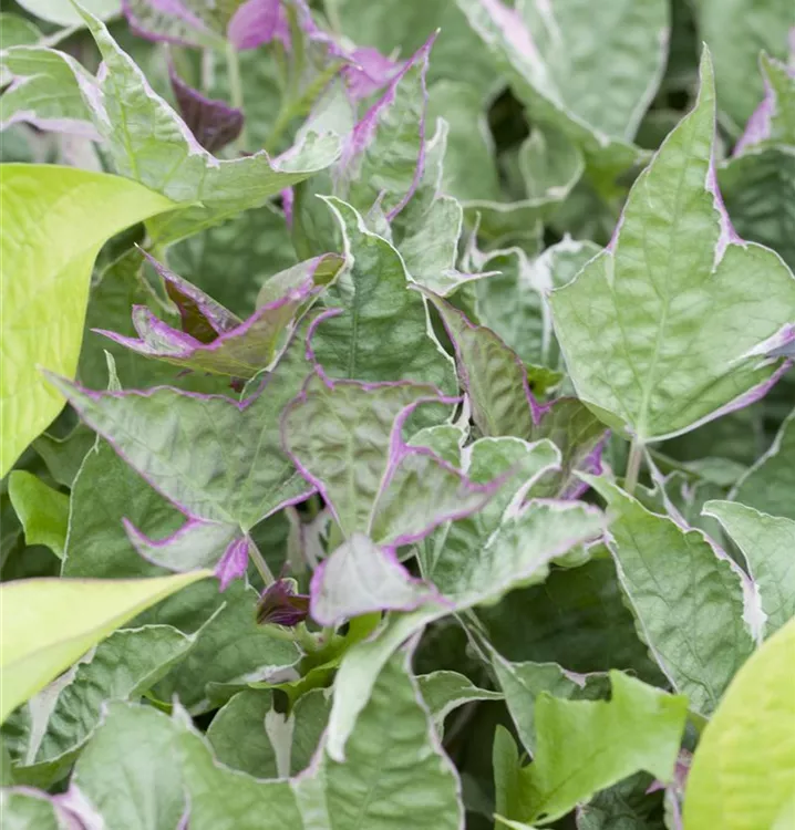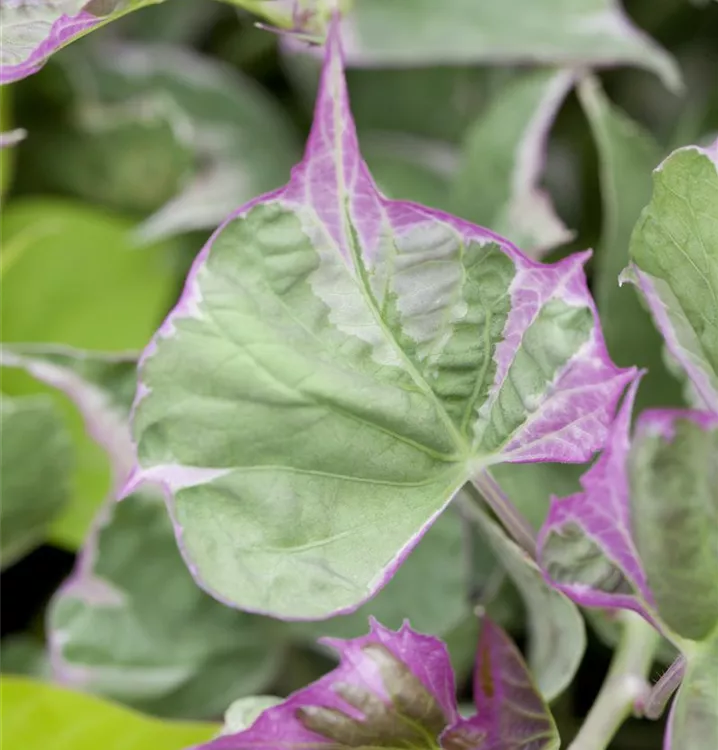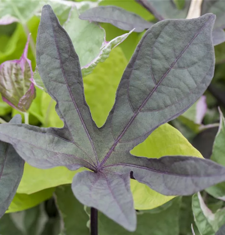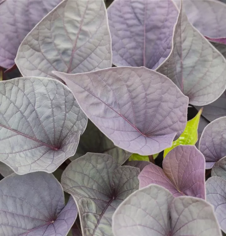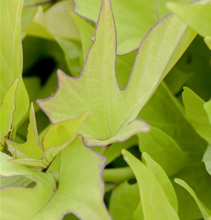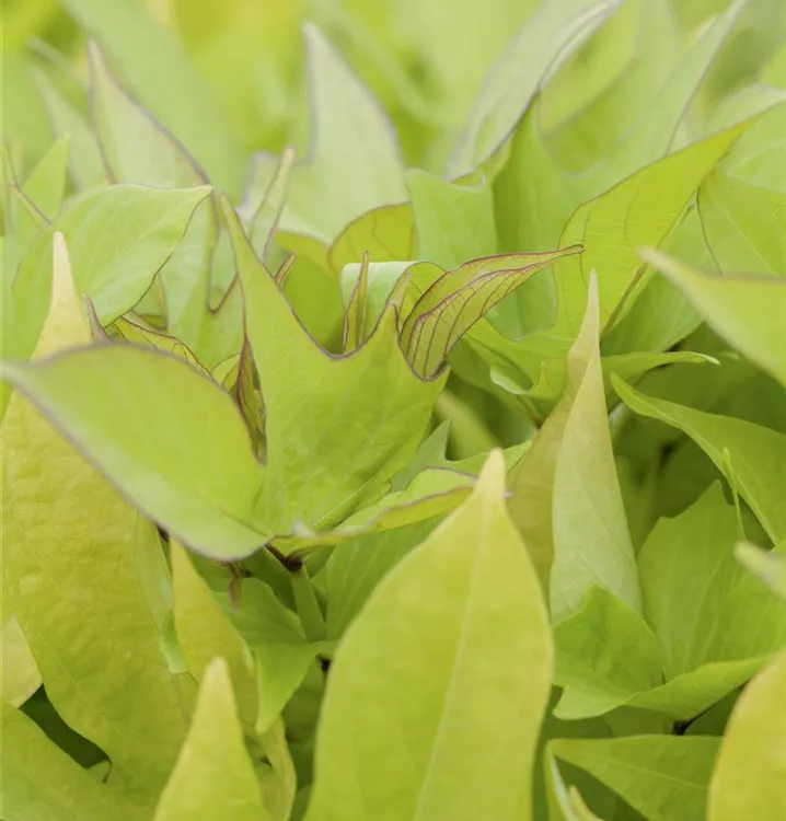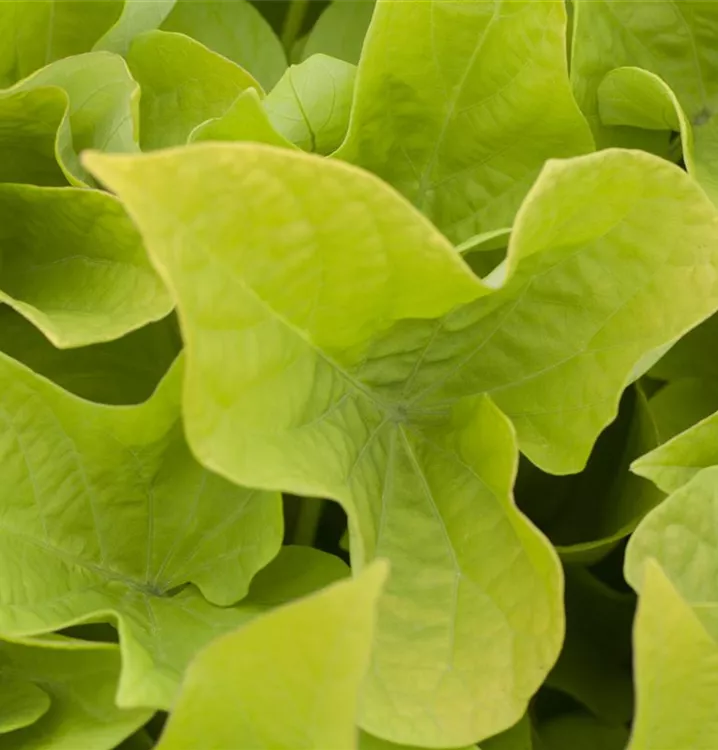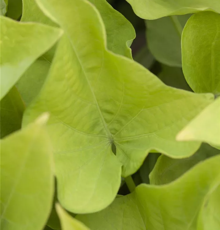 Die sommergrünen Blätter der Süßkartoffel sind mittelgrün, herzförmig.