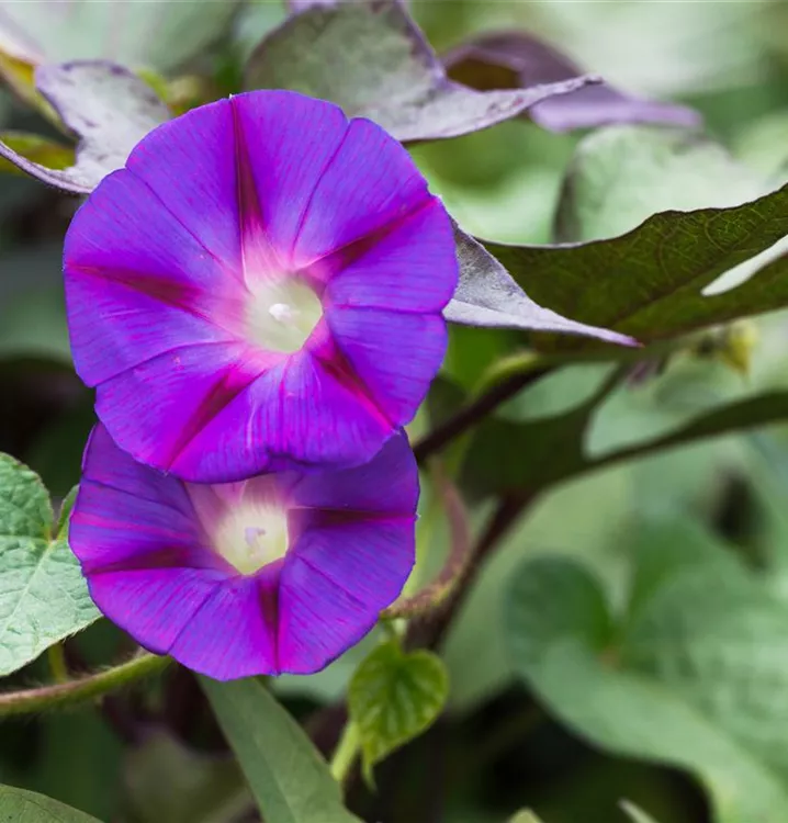 Die Himmelblaue Prunkwinde (Ipomoea tricolor) ist eine kletternde Pflanze, die blaue, violette oder weiße Blüten hervorbringt. Sie erscheinen von Juli bis Oktober. Zudem trägt die Himmelblaue Prunkwinde, herzförmige, mittelgrüne Blätter. An einem sonnigen bis halbschattigen Standort mit durchlässigem, nährstoffreichem Boden erreicht sie gewöhnlich eine Höhe von ca. 2 m und wird ca. 1 m breit.