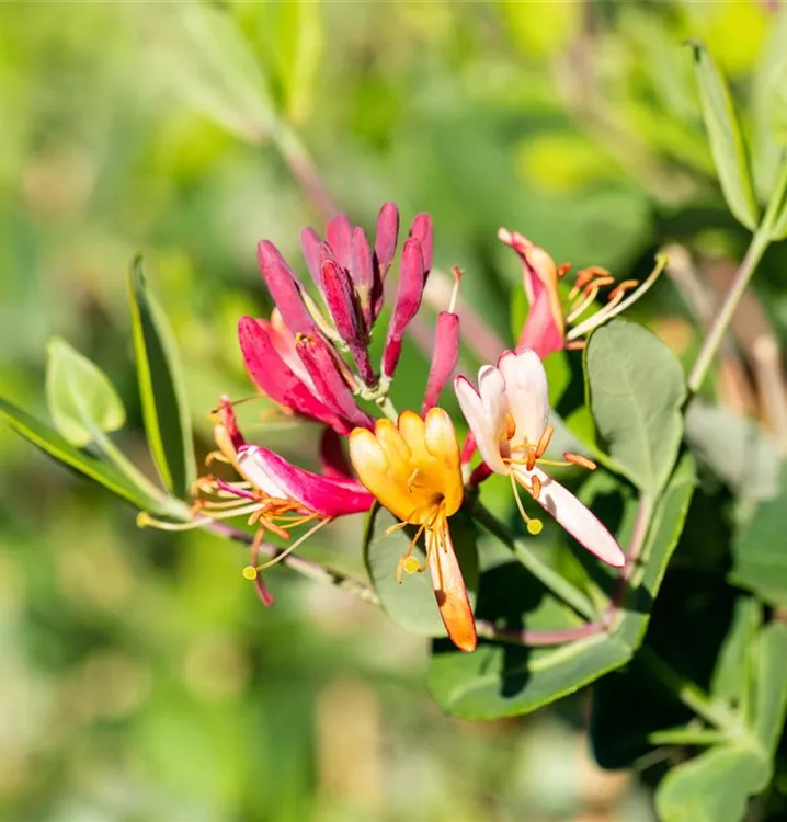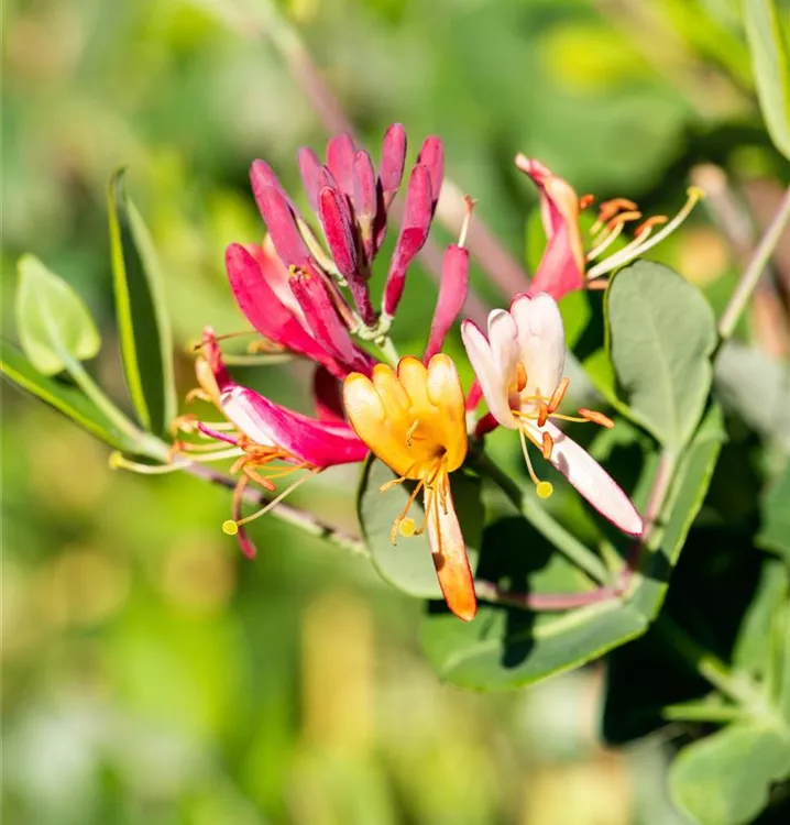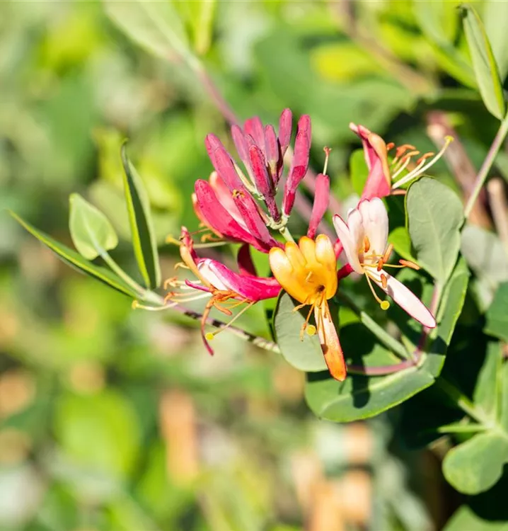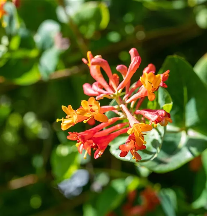 Die Rote Geißschlinge 'Dropmore Scarlet' (Lonicera x brownii) ist eine kletternde, rankende Gartenpflanze, die orange-rote, röhrenförmige Blüten hervorbringt. Sie erscheinen von Juni bis September. Bei richtiger Pflege blüht die Rote Geißschlinge 'Dropmore Scarlet' erneut im Oktober. An einem sonnigen bis schattigen Standort mit durchlässigem, humosem, kalkhaltigem, nährstoffreichem Boden erreicht sie gewöhnlich eine Höhe von ca. 5 m und wird ca. 2 m breit.