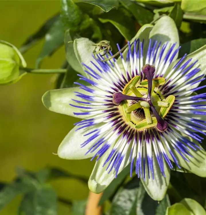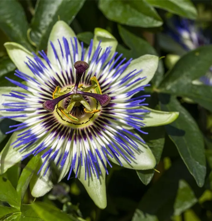 Die Blaue Passionsblume (Passiflora caerulea) eine kletternde Gartenpflanze, die, je nach Sorte, radförmige Blüten in verschiedenen Farben hervorbringt. An einem sonnigen bis halbschattigen Standort mit durchlässigem, humosem, nährstoffreichem Boden erreicht sie gewöhnlich eine Höhe von ca. 4 m und wird ca. 1 m breit.
