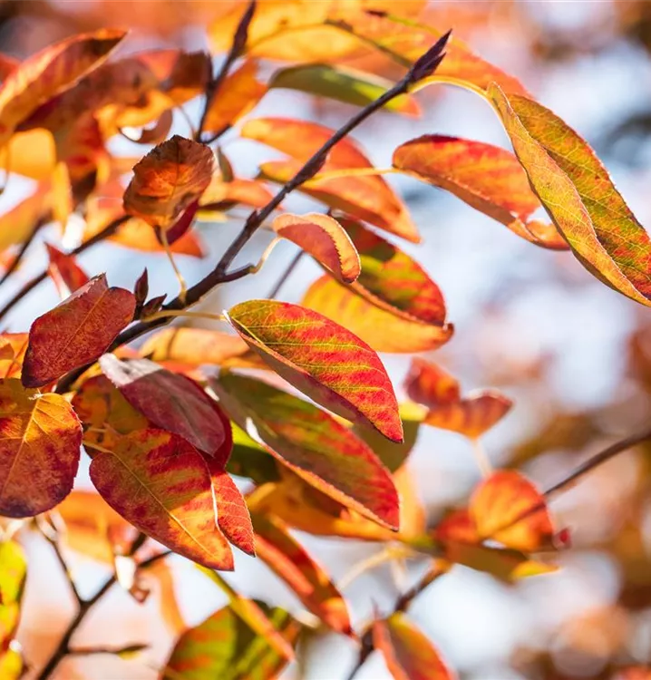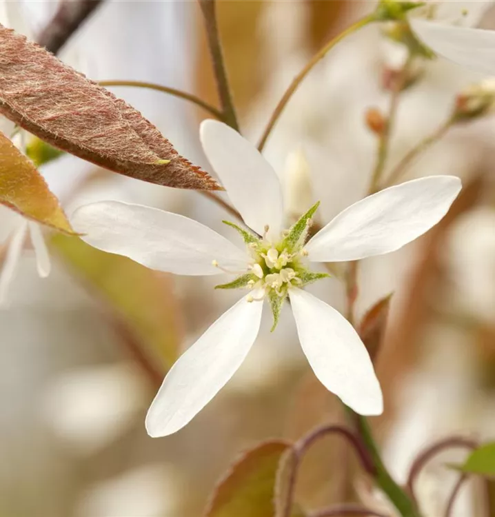 Die sommergrünen Blätter der Kupfer-Felsenbirne sind mittelgrün, eiförmig, wechselständig. Diese sind etwa 3 - 8 cm groß. Kupferoranger Austrieb. Kupfer-Felsenbirne zeigt sich leuchtend orange-rot im Herbst.