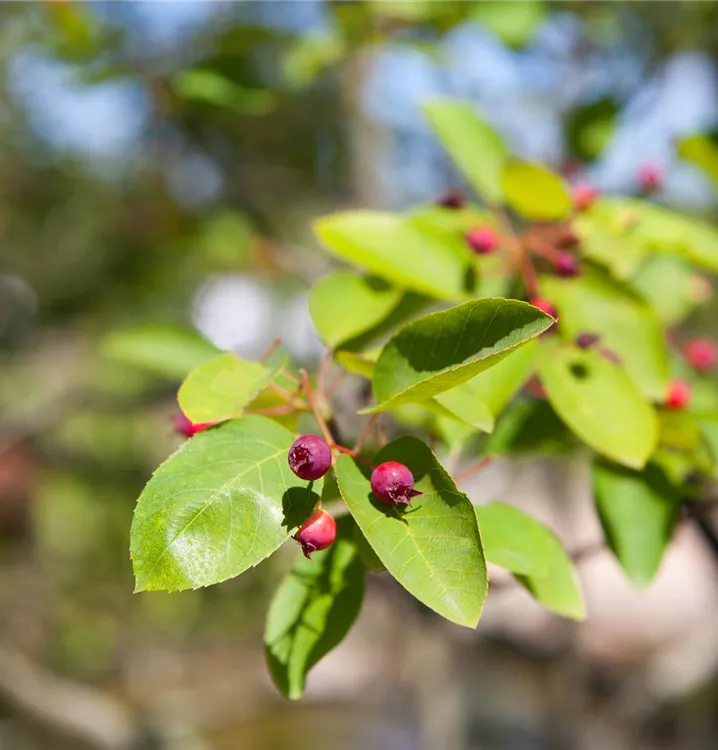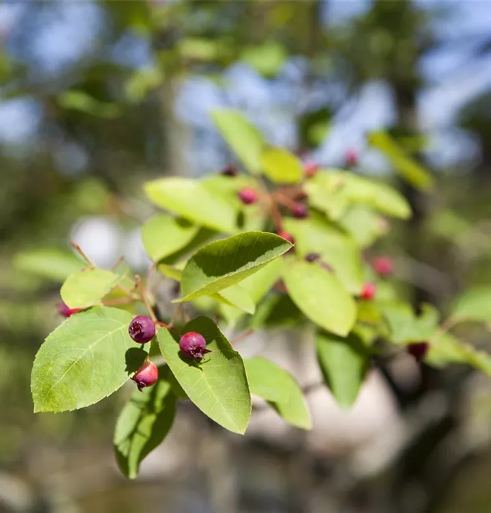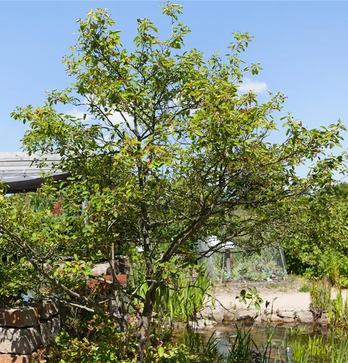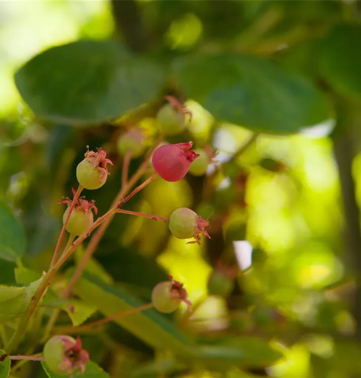 Die dunkelblauen, kleinen Kernfrüchte haben einen süßen Geschmack. Die Kernfrüchte sind rund. Reifezeit ab Juni.