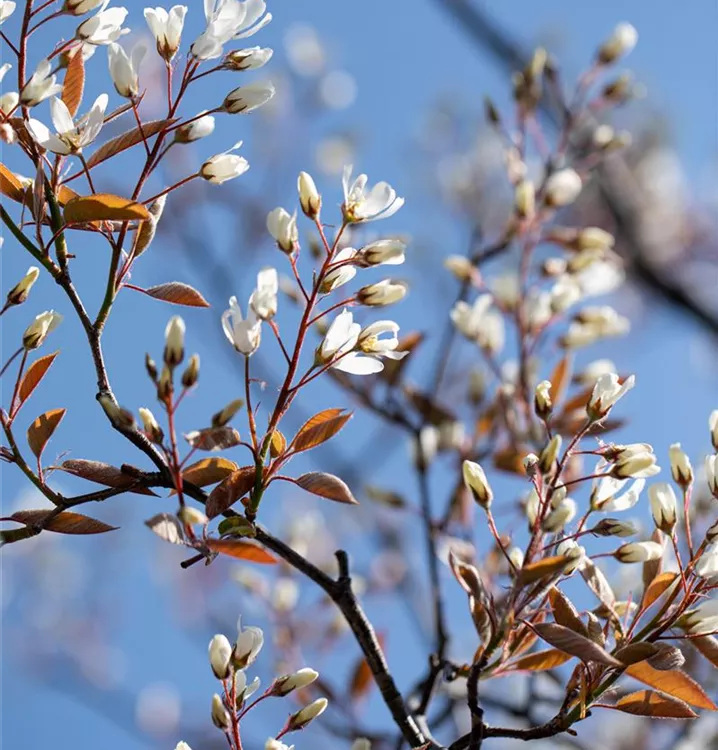 Die Kupfer-Felsenbirne (Amelanchier lamarckii) ist ein aufrechter, mehrstämmiger Großstrauch, der weiße Blüten hervorbringt. Sie erscheinen von April bis Mai. Aus diesen gehen ab Juni dunkelblaue, runde Früchte hervor. Sie sind klein. Zudem trägt die Kupfer-Felsenbirne, eiförmige, mittelgrüne Blätter. Auch der kupferorange Austrieb ist sehr schön. An einem sonnigen bis halbschattigen Standort mit durchlässigem, humosem Boden erreicht sie gewöhnlich eine Höhe von ca. 8 m und wird ca. 8 m breit.
