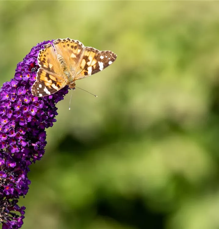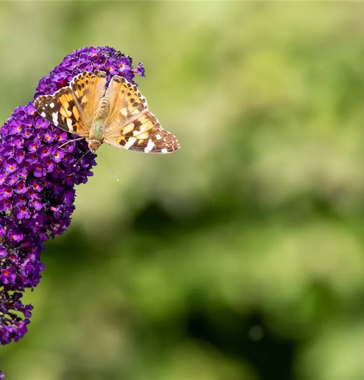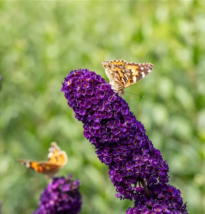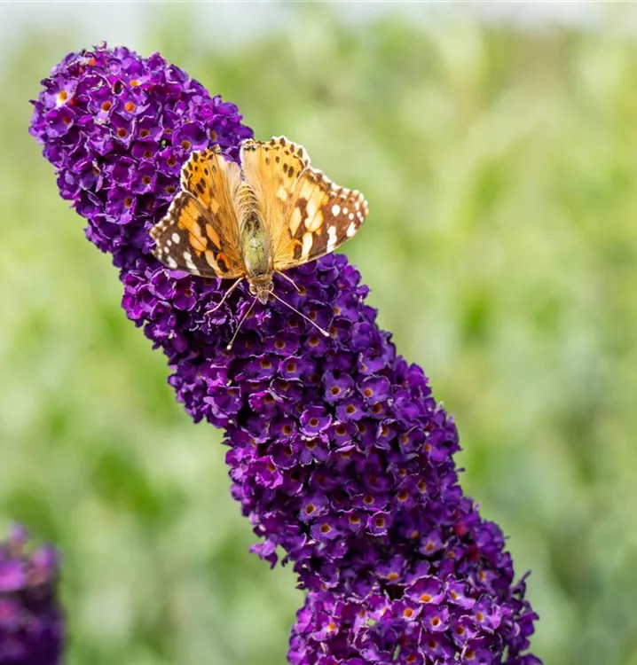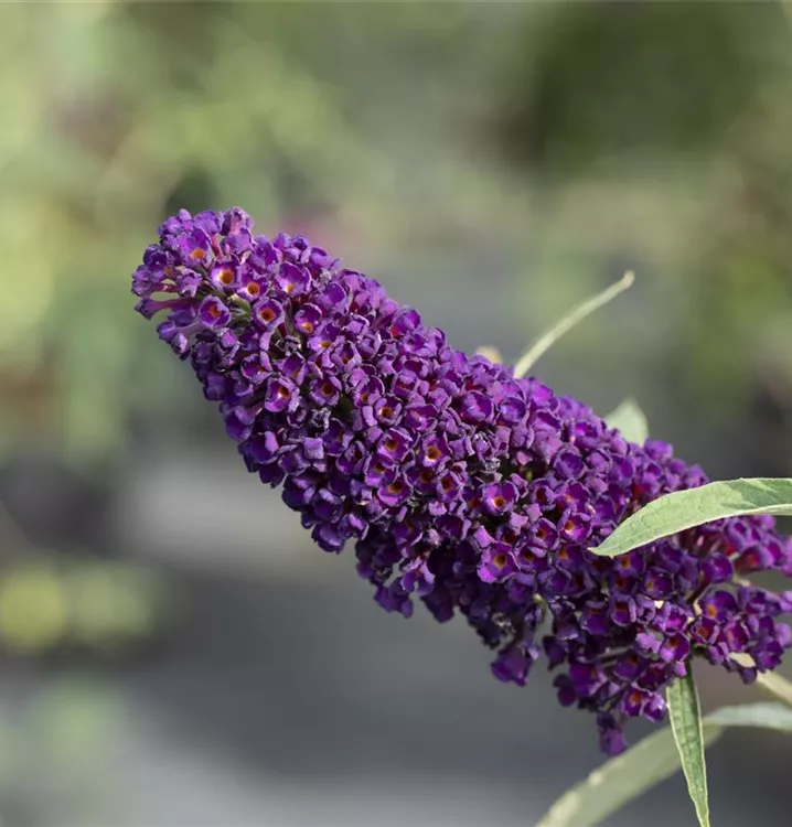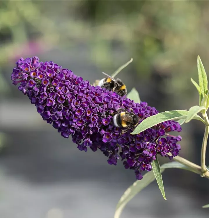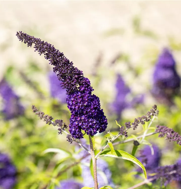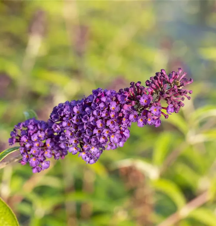 Die violetten Blüten des Sommerflieder 'Black Knight' erscheinen in Rispen von Juli bis Oktober. Diese werden etwa 20 - 30 cm groß und sind stark duftend.