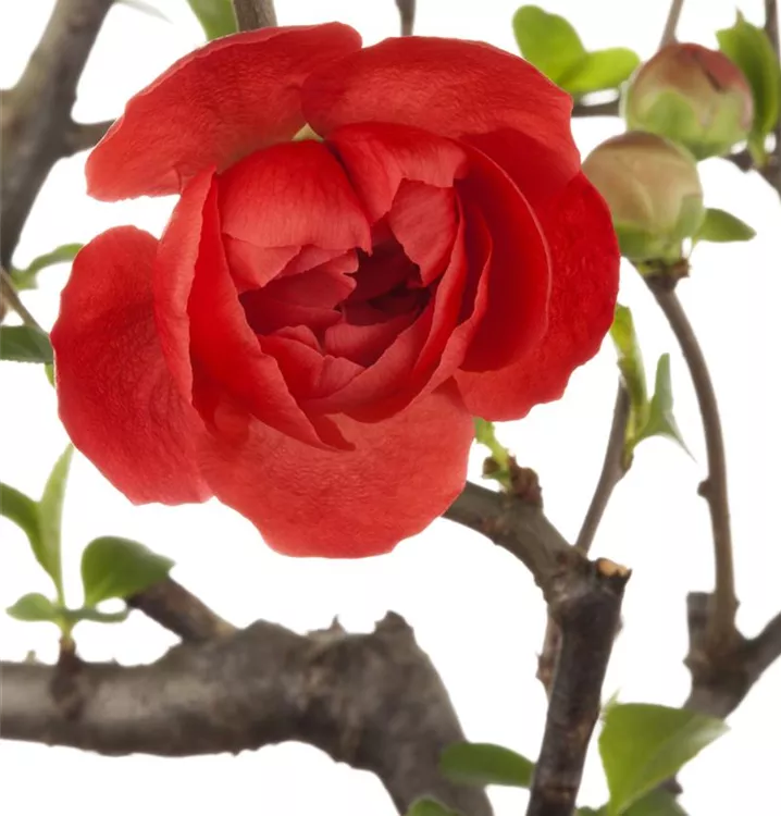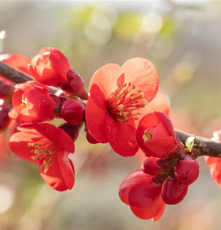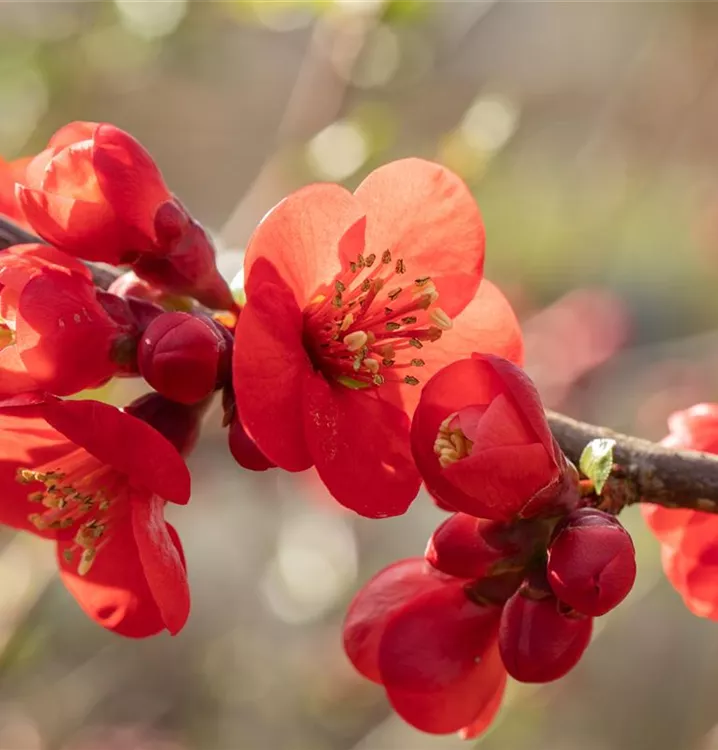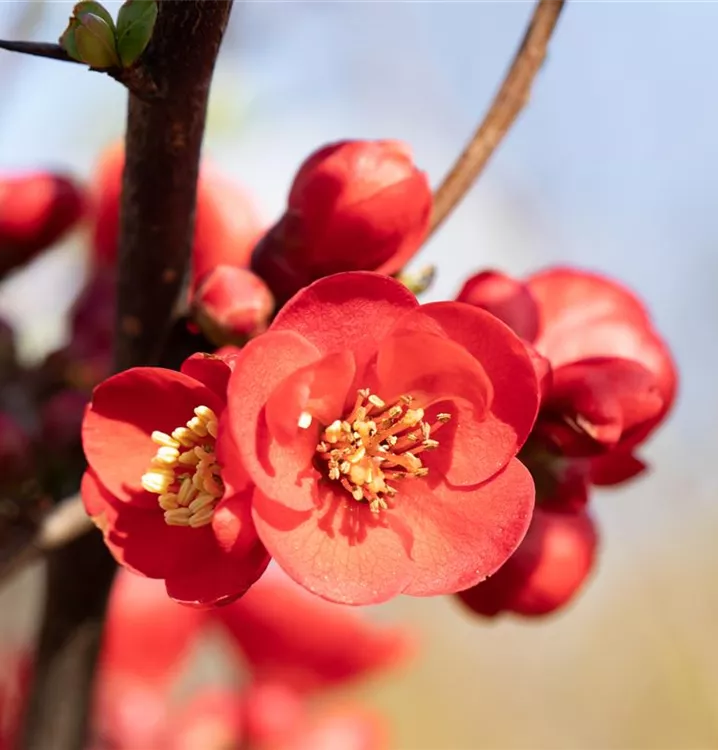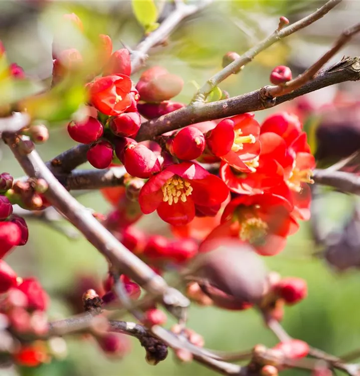 Die Niedrige Scheinquitte (Chaenomeles japonica) ist ein ausladender Kleinstrauch mit dekorativen, gelben, orangefarbenen, birnenförmigen Früchten. Diesen voraus bringt sie von Mai bis Juni rote Blüten hervor. Zudem trägt die Niedrige Scheinquitte, eiförmige, mittelgrüne Blätter. An einem sonnigen bis halbschattigen Standort erreicht sie gewöhnlich eine Höhe von ca. 1,5 m und wird ca. 1,2 m breit. An den Boden stellt die Niedrige Scheinquitte keine besonderen Ansprüche.