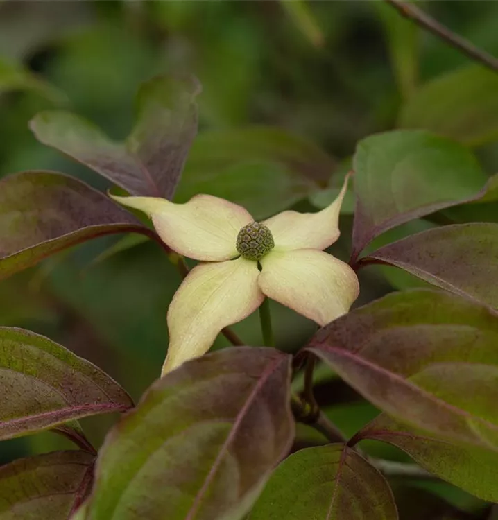 Der Japanische Blumen-Hartriegel 'Cappuccino'® (Cornus kousa) ist ein aufrechter, trichterförmiger Großstrauch mit dekorativen, runden Früchten. Die cremeweiß-rosafarbenen Blüten erscheinen von Ende Mai bis Juni. Auch der bordeauxrote Austrieb ist sehr schön.