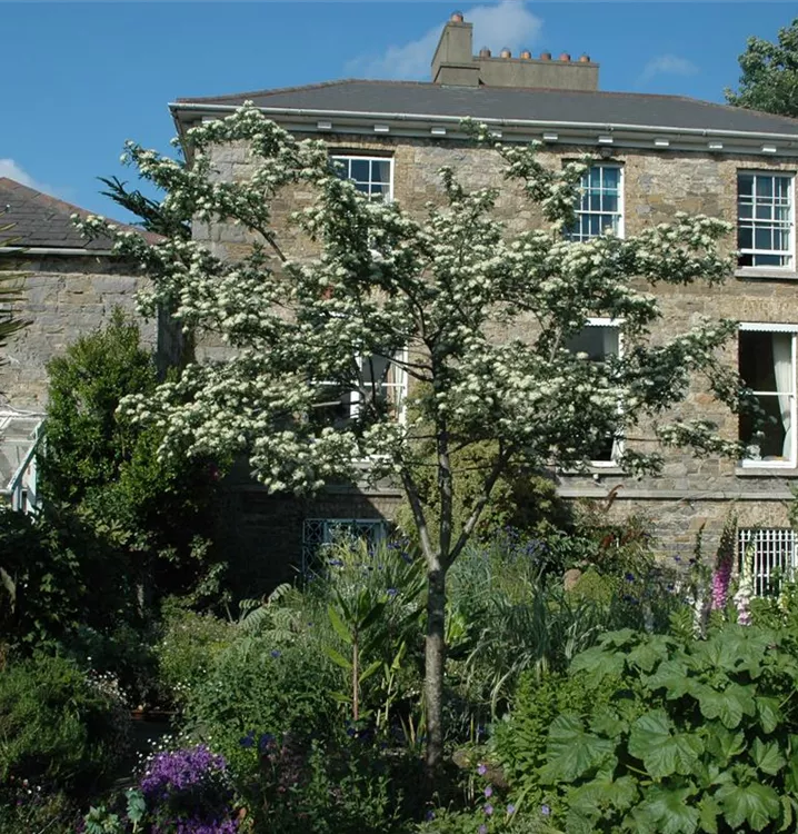 Der Eingriffelige Weißdorn (Crataegus monogyna) ist ein aufrechter, malerischer Großstrauch mit dekorativen, dunkelroten, runden Früchten. Diesen voraus bringt er von Mai bis Juni weiße, in Rispen angeordnete Blüten hervor. Zudem trägt der Eingriffelige Weißdorn, geschnittene, dunkelgrüne Blätter. An einem sonnigen bis halbschattigen Standort mit kalkhaltigem, nährstoffreichem Boden erreicht er gewöhnlich eine Höhe von ca. 6 m und wird ca. 5 m breit.