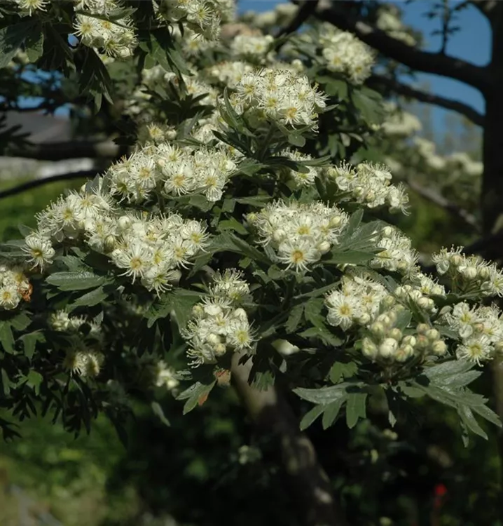 Die weißen Blüten des Eingriffeligen Weißdorn erscheinen in Rispen von Mai bis Juni.