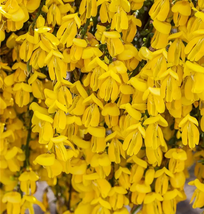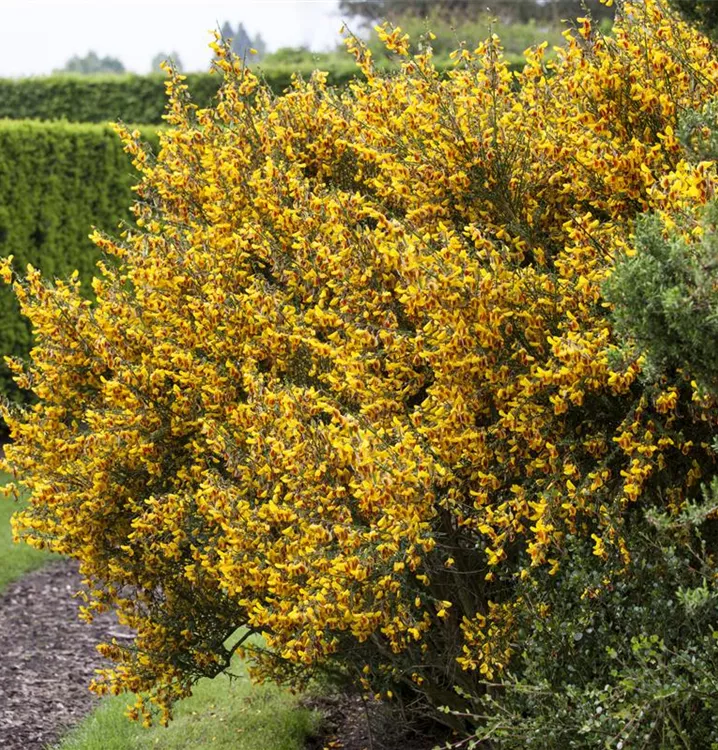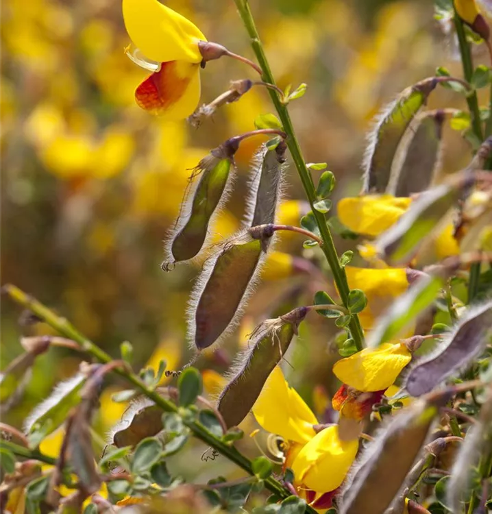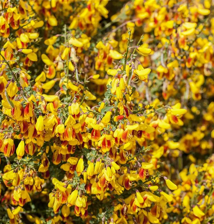 Der Besenginster (Cytisus scoparius) ein aufrechter, verzweigter Strauch, der, je nach Sorte, schmetterlingsförmige Blüten in verschiedenen Farben hervorbringt. An einem sonnigen Standort mit humosem, sandigem, saurem Boden erreicht er gewöhnlich eine Höhe von ca. 2 m und wird ca. 2 m breit.