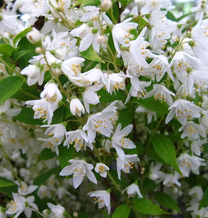 Der Maiblumenstrauch (Deutzia gracilis) ein buschiger, aufrechter, dichter Kleinstrauch, der, je nach Sorte, glockenförmige Blüten in verschiedenen Farben hervorbringt. An einem sonnigen Standort mit durchlässigem, nährstoffreichem Boden erreicht er gewöhnlich eine Höhe von ca. 80 cm und wird ca. 1 m breit.
