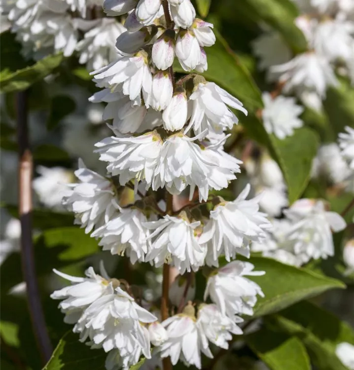 Die weißen, gefüllten Blüten des Gefüllten Sternchenstrauch 'Plena' erscheinen in Rispen von Juni bis Juli. Diese werden etwa 1 - 2 cm groß.