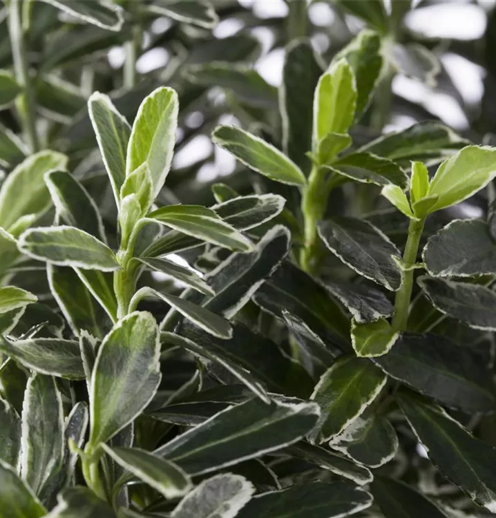 Die immergrünen Blätter der Immergrüne Japanspindel sind bunt, eiförmig, gesägt.