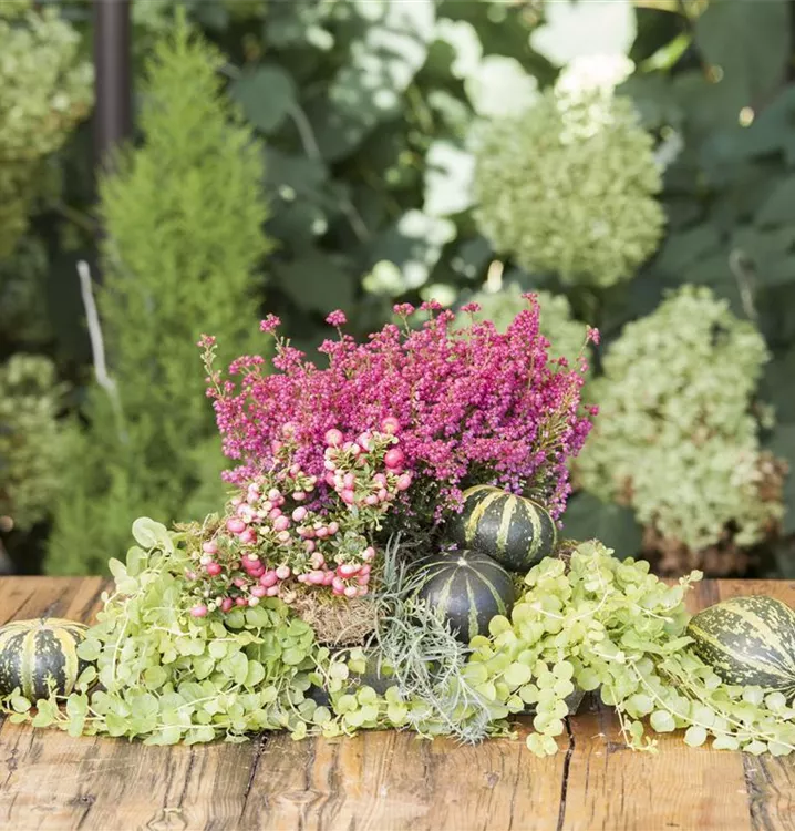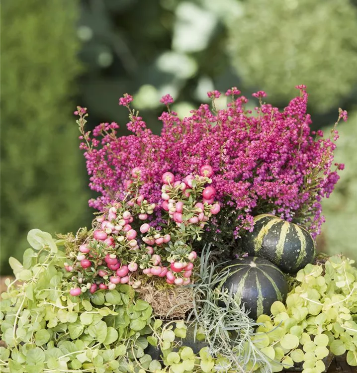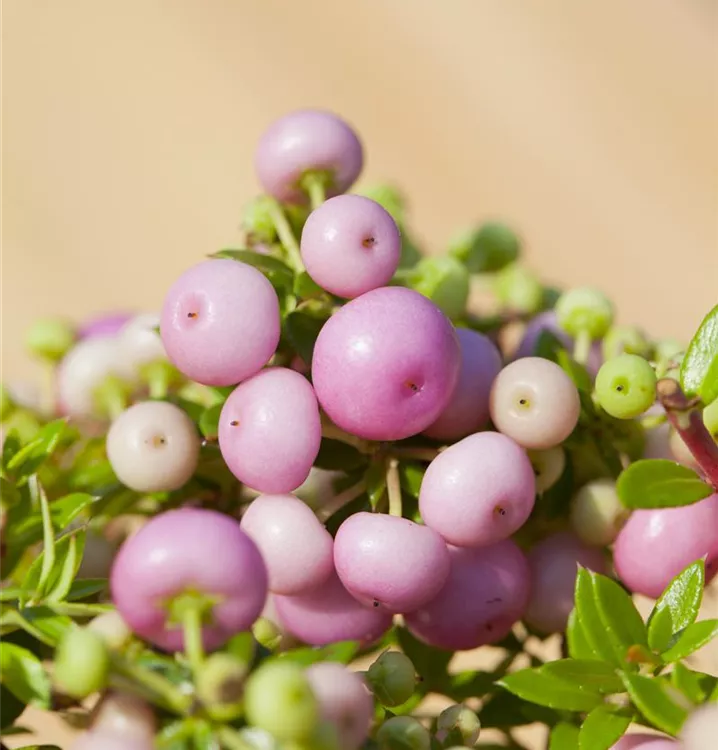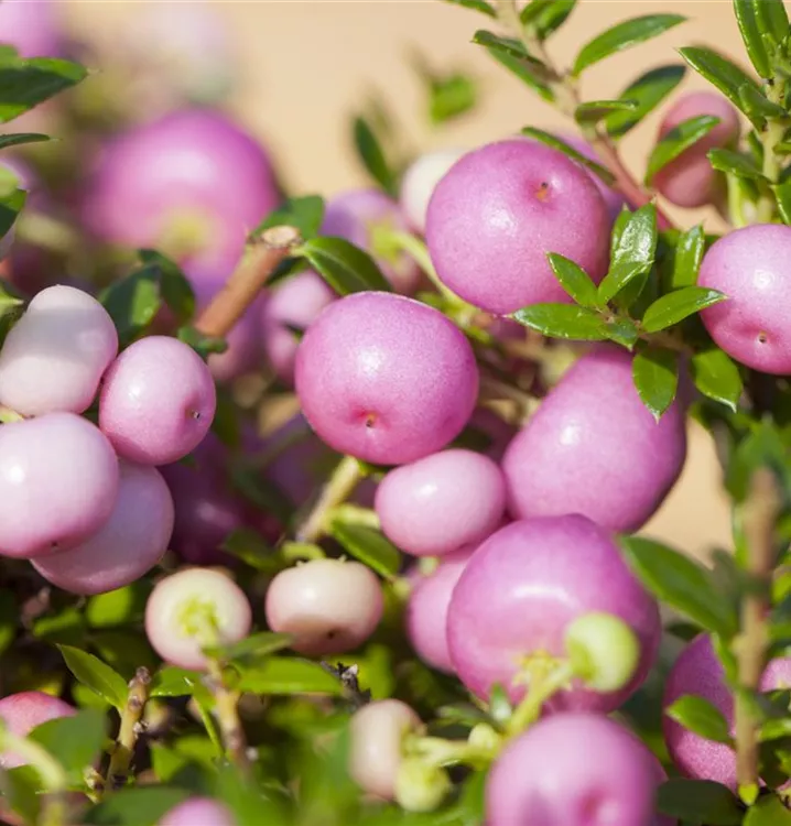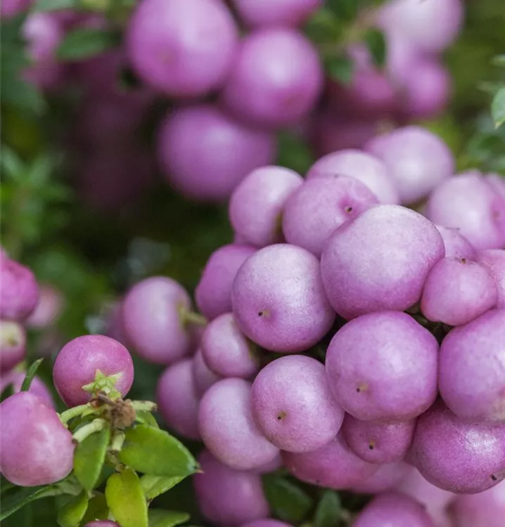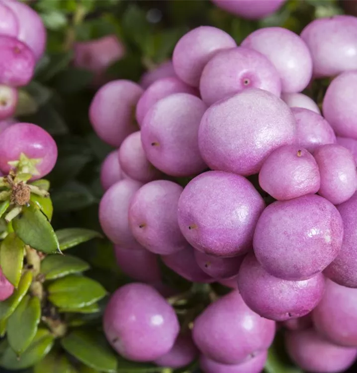 Besonders dekorativ sind die rosaroten, runden Beeren von Gaultheria mucronata. Diese erscheinen ab September.