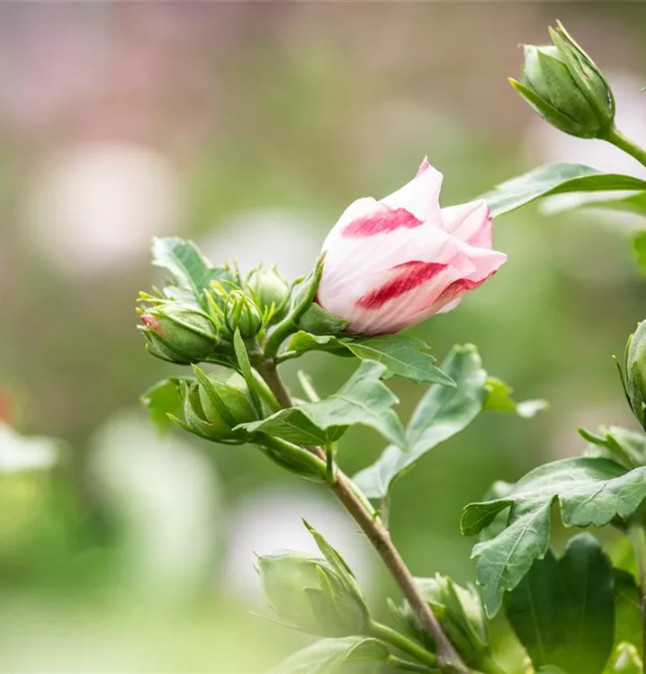 Der Garteneibisch 'Hamabo' (Hibiscus syriacus) ist ein aufrechter Strauch, der rosa-rote, schalenförmige Blüten hervorbringt. Sie erscheinen von Juli bis September. Zudem trägt der Garteneibisch 'Hamabo', eiförmige, mittelgrüne Blätter. An einem sonnigen bis halbschattigen, windgeschützten Standort mit durchlässigem, nährstoffreichem Boden erreicht er gewöhnlich eine Höhe von ca. 2 m und wird ca. 1,5 m breit.