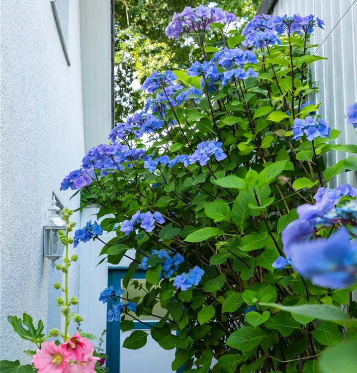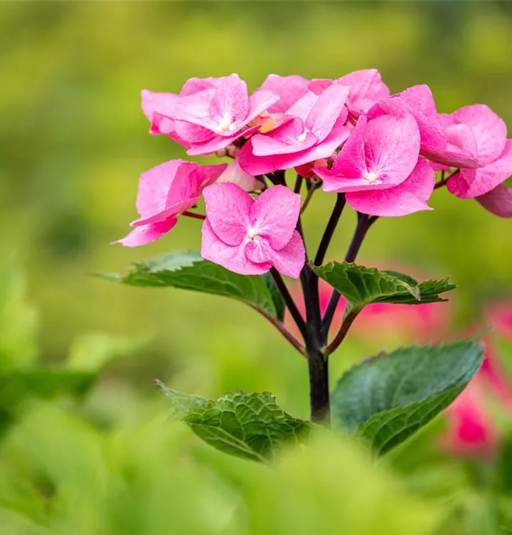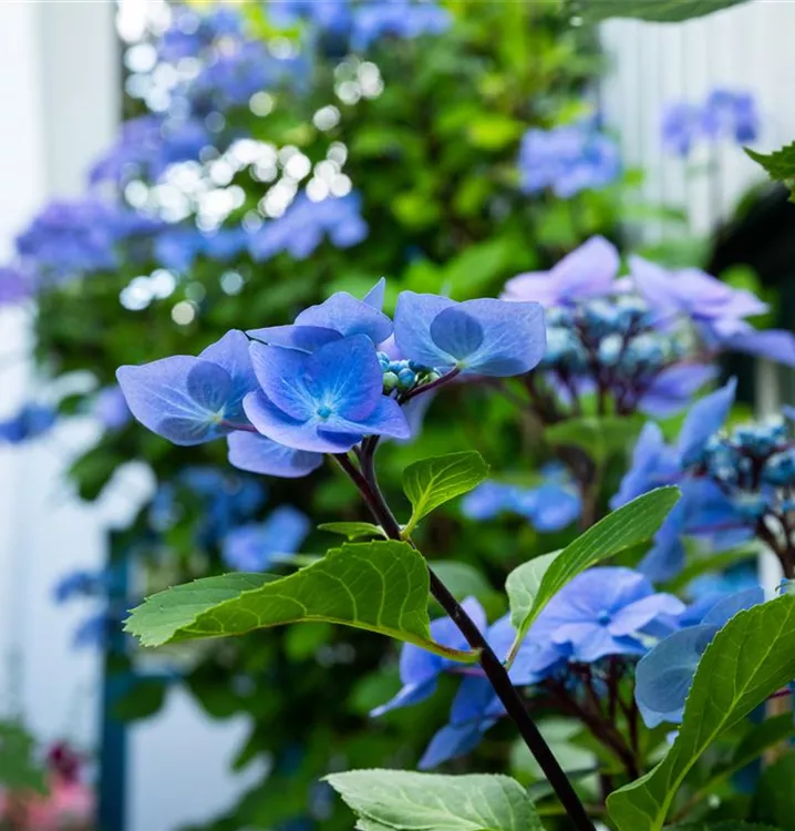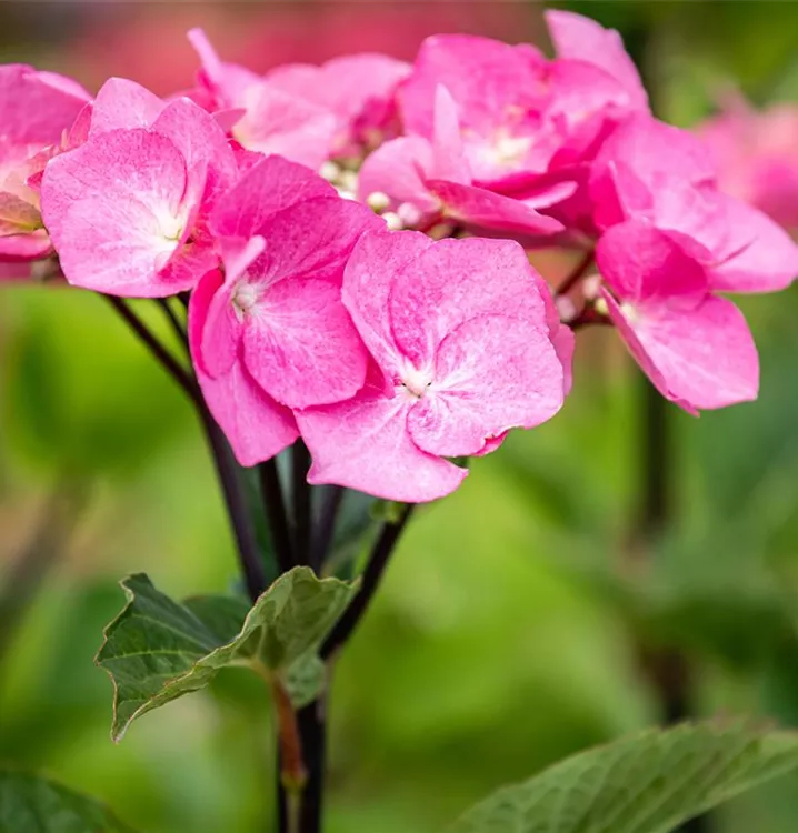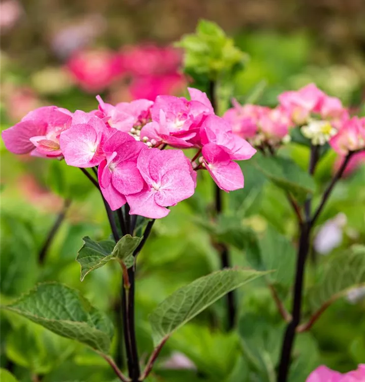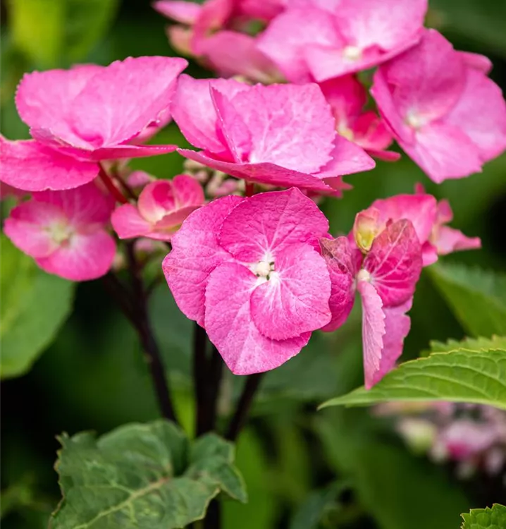 Die blauen, rosafarbenen, roten, weißen, schalenförmigen Blüten der Gartenhortensie 'Black Steel'® erscheinen in Dolden von Juni bis September.